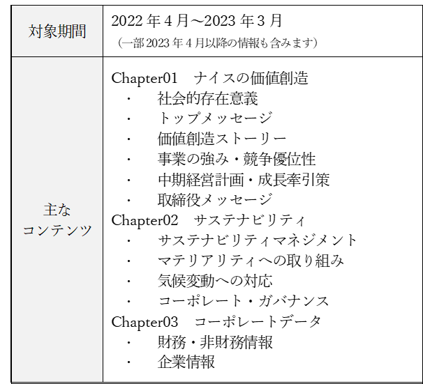 ナイス株式会社(本社:横浜市鶴見区、社長:杉田 理之)はこのたび、中長期的な価値創造に向けた方針や戦略、取り組みなどを財務・非財務の両面からステークホルダーの皆様にお伝えし、当社グループへのご理解をより一層深めていただくことを目的として「統合報告書2023」を発行、11月7日にホームページに公開いたしました。