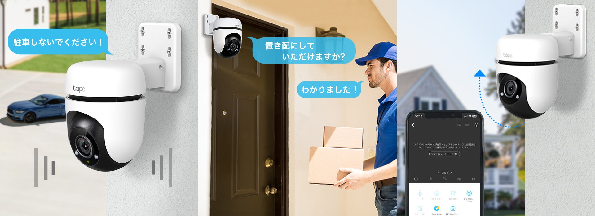アラーム機能では、ユーザーが吹き込んだ音声を動作検知時の警告音としてカスタマイズできます。また、内蔵のマイクとスピーカーを通じてコミュニケーションが取れるため、不在時の来客や宅配便にも応対可能に。物理的にカメラのレンズを隠せるフィジカルプライバシーモードにも対応し、安心して使用することができます。