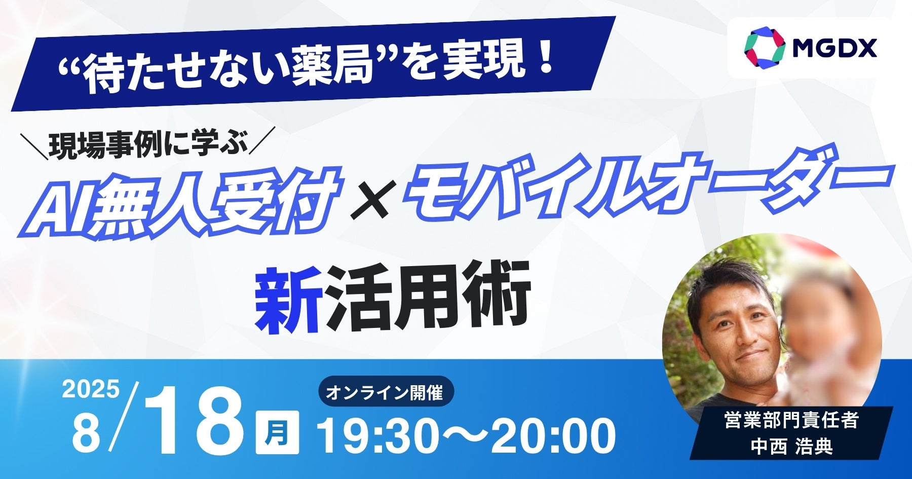 株式会社サイバーエージェント(本社:東京都渋谷区、代表取締役:藤田晋、東証プライム市場:証券コード4751)の連結子会社である医療AIカンパニー、株式会社MG-DX(本社:東京都渋谷区、代表取締役社長:堂前紀郎、以下「当社」)は、オンラインセミナー「“待たせない薬局”を実現! 現場事例に学ぶAI無人受付×モバイルオーダー新活用術」を2025年8月18日(月)に開催いたします。