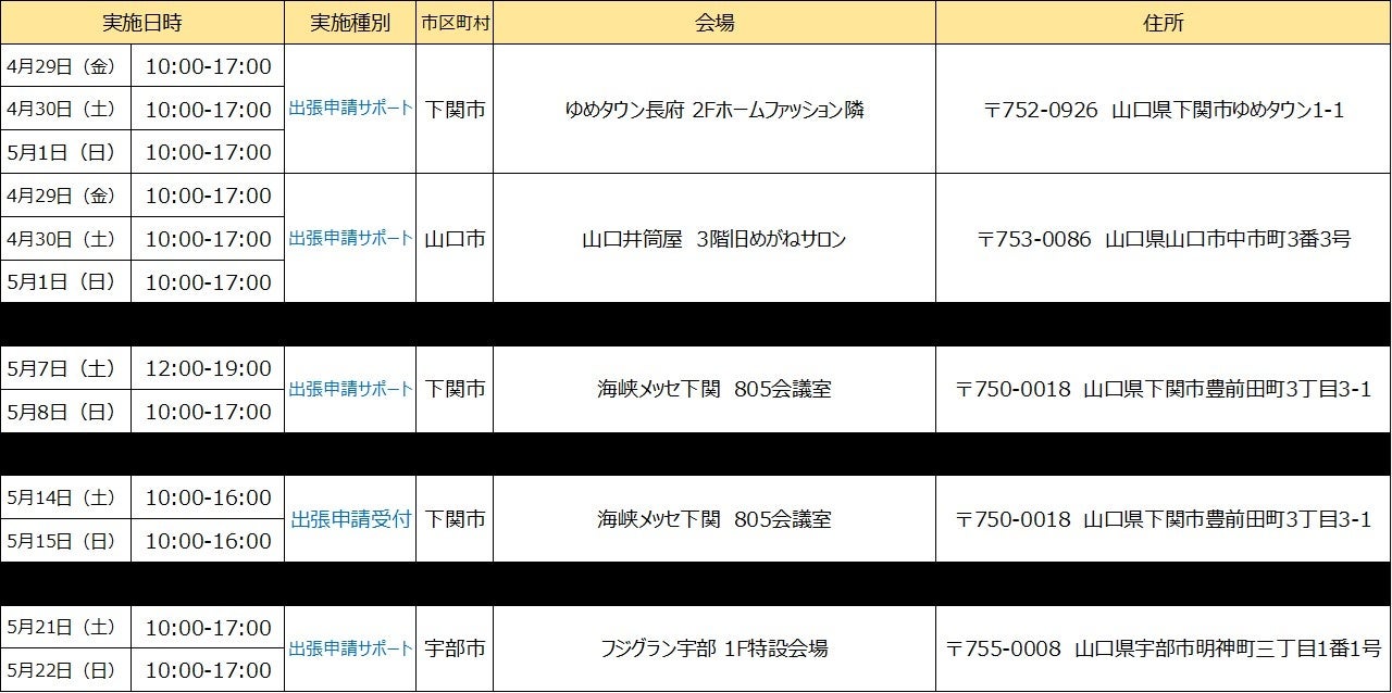 ※開催場所の調整状況や新型コロナウィルスの感染状況等により、「出張申請受付」及び「出張申請サポート」の開催を中止・延期、または実施内容が変更となる可能性がございます。