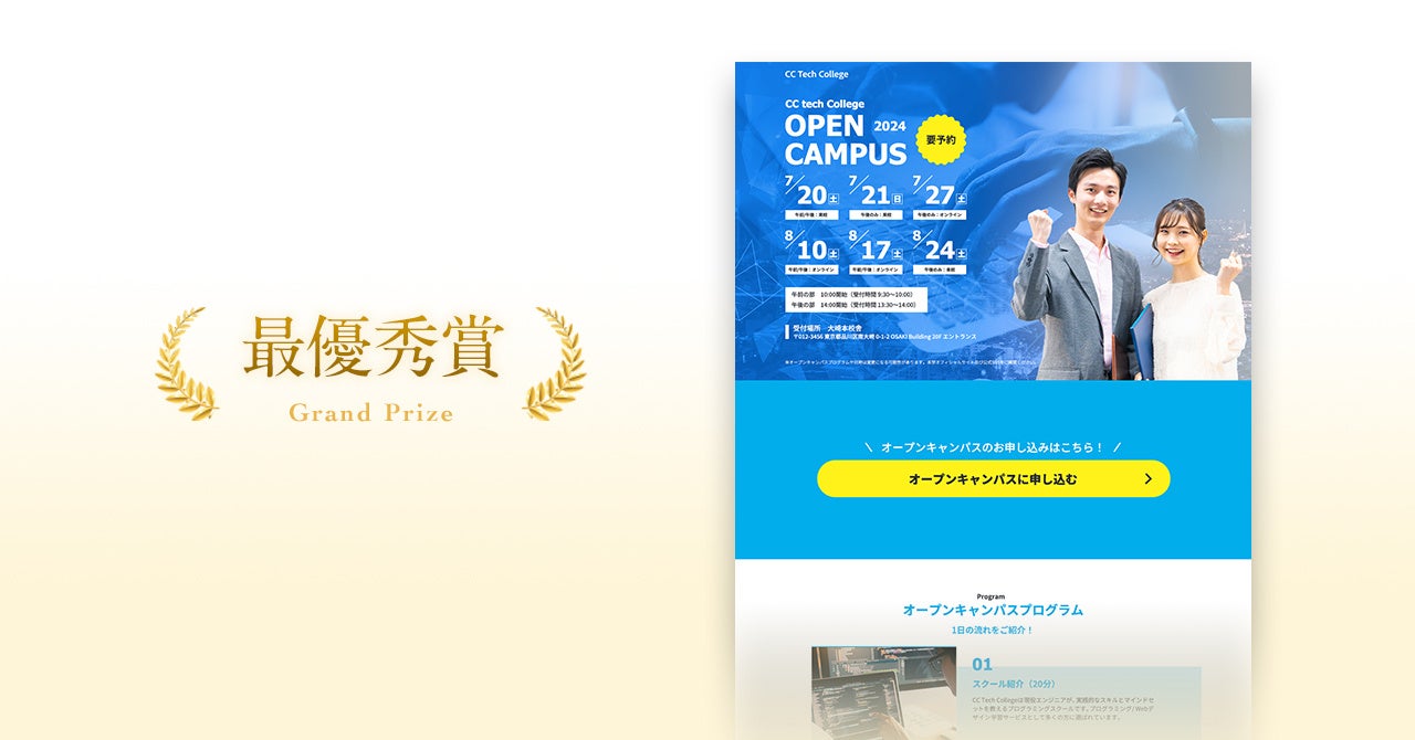 2024年第1回目は、通信制大学オープンキャンパスのランディングページ作成をテーマに作品を募集しました(提出課題の要件は後述)。エントリー者の中から、特に優れたデザインを作成した3名を最優秀賞・優秀賞・入賞に選出いたしましたので発表します。