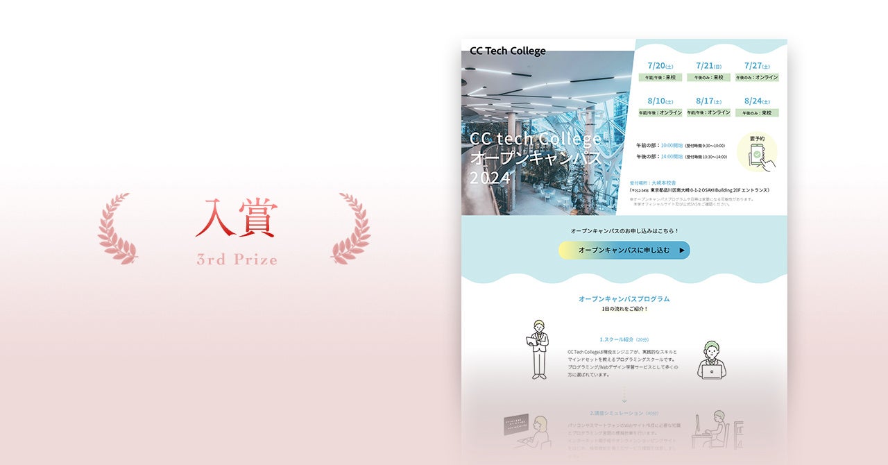 今回は2回目の応募で入賞を目指していたため、大変嬉しく思います。「ITの先端学習を提供する学び舎」と「季節感」、二つの要素をどのように融和させるかが難しく、試行錯誤しながら制作しました。デザインスキルはまだまだ未熟だと感じておりますので、今後も様々な機会にチャレンジしていきたいと思います。