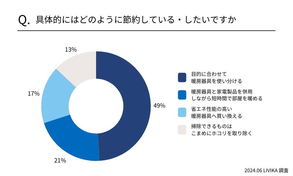 暖房器具の使用頻度を抑える以外に、「目的にあわせて暖房器具を使い分ける」49%、「暖房器具と家電製品を併用し短時間で部屋を温める」21%、「省エネ機能の高いものに切り替える」17%など、様々な方法で暖房器具の節約を行っていることが分かりました。