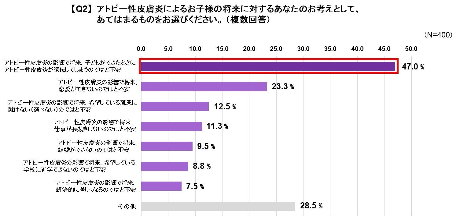 アトピー性皮膚炎によるお子様の将来に対する不安をお聞きしたところ、「子どもができたときにアトピー性皮膚炎が遺伝してしまうのではと不安」が47.0%で、最多回答でした。恋愛や就職への不安よりも「遺伝」への不安を大きく抱えていることがわかる結果となりました。