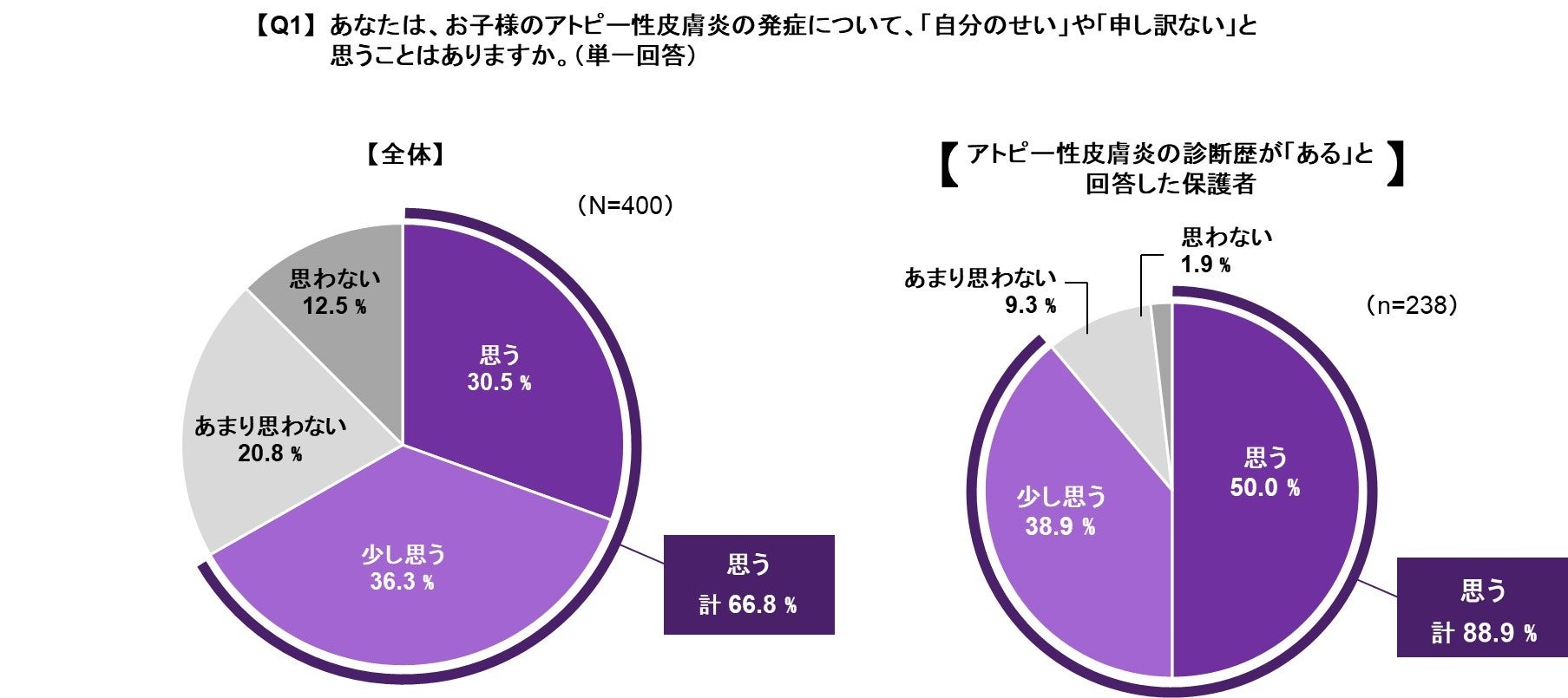 1.子どものアトピー性皮膚炎発症について、「自分のせい」や「申し訳ない」と思って いる保護者は66.8%。自身にもアトピー性皮膚炎の診断歴がある場合では、88.9% が「自分のせい」、「申し訳ない」と思っている