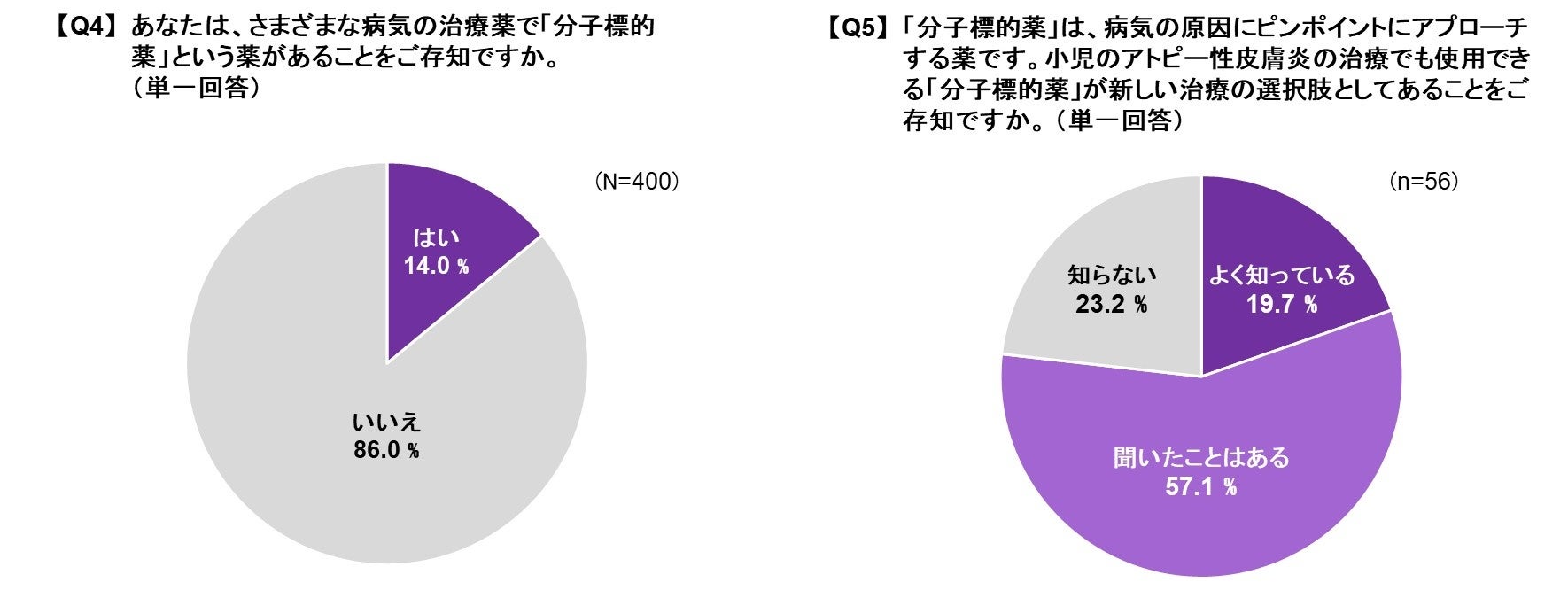 しかし今回の調査結果で、約9割の中等症以上の小児患者さんの保護者が、小児でも使用できるアトピー性皮膚炎の原因物質を標的とした新しい治療法「分子標的薬」があることを知らないと回答しています。また、約7割がお子様のアトピー性皮膚炎の発症について「自分のせい」、「申し訳ない」と思うことがあると回答しており、症状のあるお子様だけでなく、サポートする保護者も子どものアトピー性皮膚炎に苦悩していることが明らかになりました。