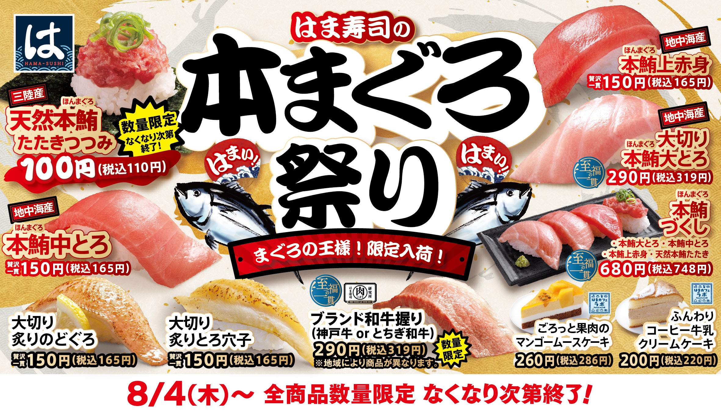 株式会社はま寿司(代表取締役社長:遠藤 哲郎 本社:東京都港区)が展開する100円寿司チェーン「はま寿司」は、8月4日(木)から、脂がのった「本鮪」を存分にお楽しみいただける「はま寿司の本まぐろ祭り」を全国の店舗で開催します。