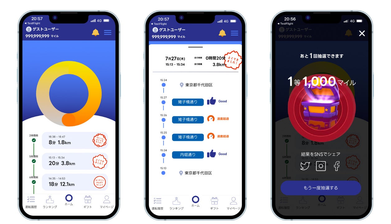 「ジオドライブ」は、安全運転をすることでマイルが貯まり、ギフトと交換することができるので、モチベーションを持って安全運転を心がけてもらえるアプリです。さらに、自社で整備しているデジタル地図を活用することで、スマートフォンだけで精度の高い安全運転診断を可能としました。