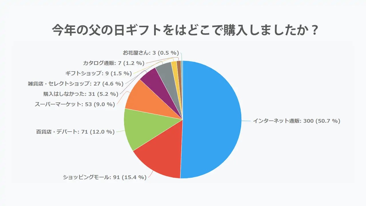 今年、一番父の日ギフトが買われた場所は「インターネット通販」で、50.7%の方が購入したと回答しました。楽天市場などの、ECモールのポイントが貯まるという理由で利用される方や、お酒類の詰め合わせギフトなど、重量の重たい商品を購入される方に特に人気のようです。
