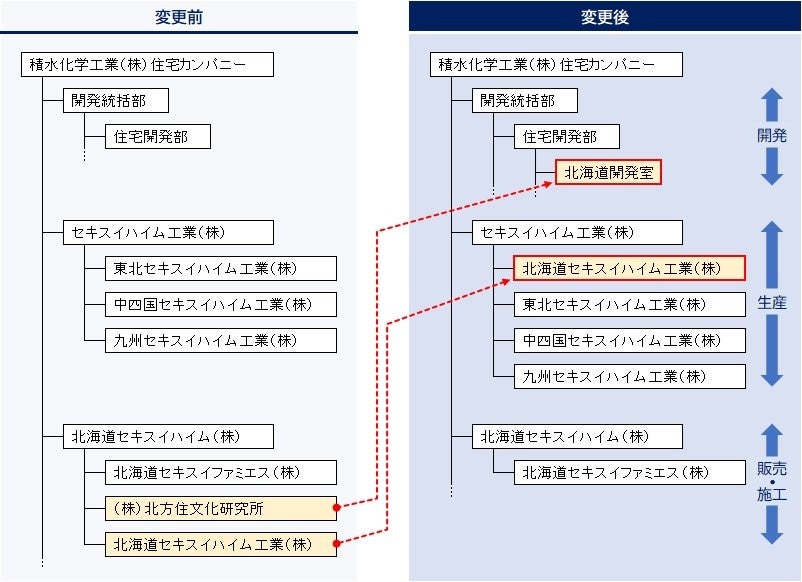 その一環として、今回、北海道向け住宅の生産部門である北海道セキスイハイム工業株式会社(本社:北海道岩見沢市、代表取締役:青谷龍哉)を、セキスイハイム工業株式会社(本社:埼玉県蓮田市、代表専務取締役:佐藤公紀)の100%出資子会社とします。また、北海道向け住宅の開発部門である株式会社北方住文化研究所(本社:北海道札幌市、代表取締役:青谷龍哉)の機能を、当社住宅カンパニー開発統括部に移管し「北海道開発室」を新設します。