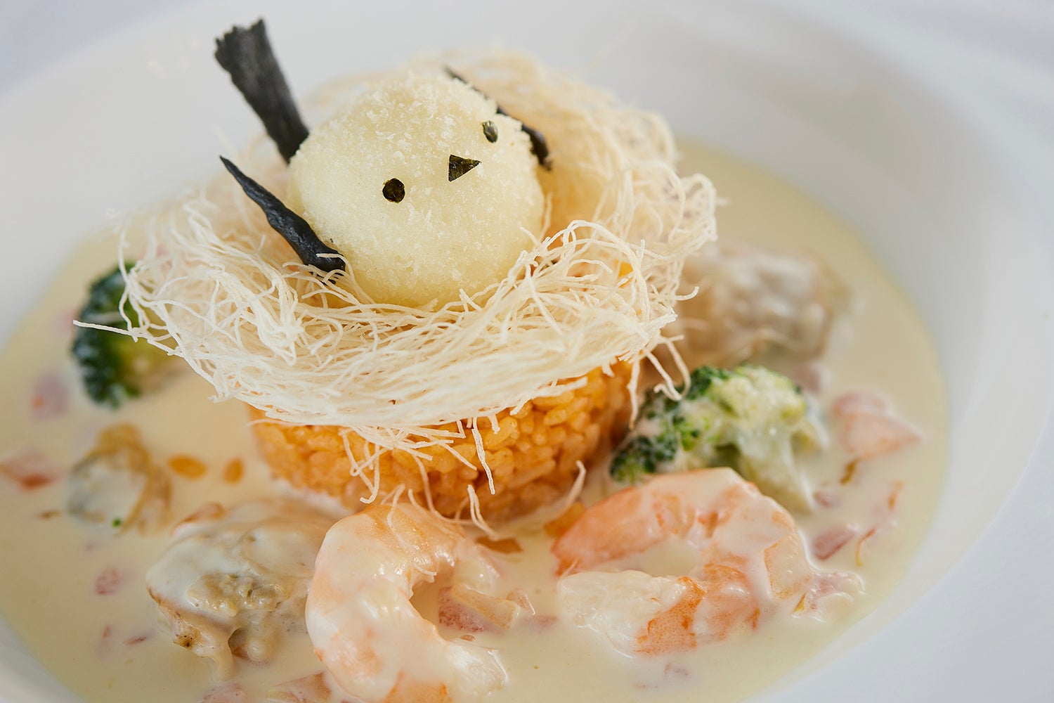シマエナガの巣に見立てたカダイフ(小麦粉原料の細麺状の生地)が印象的な一品。