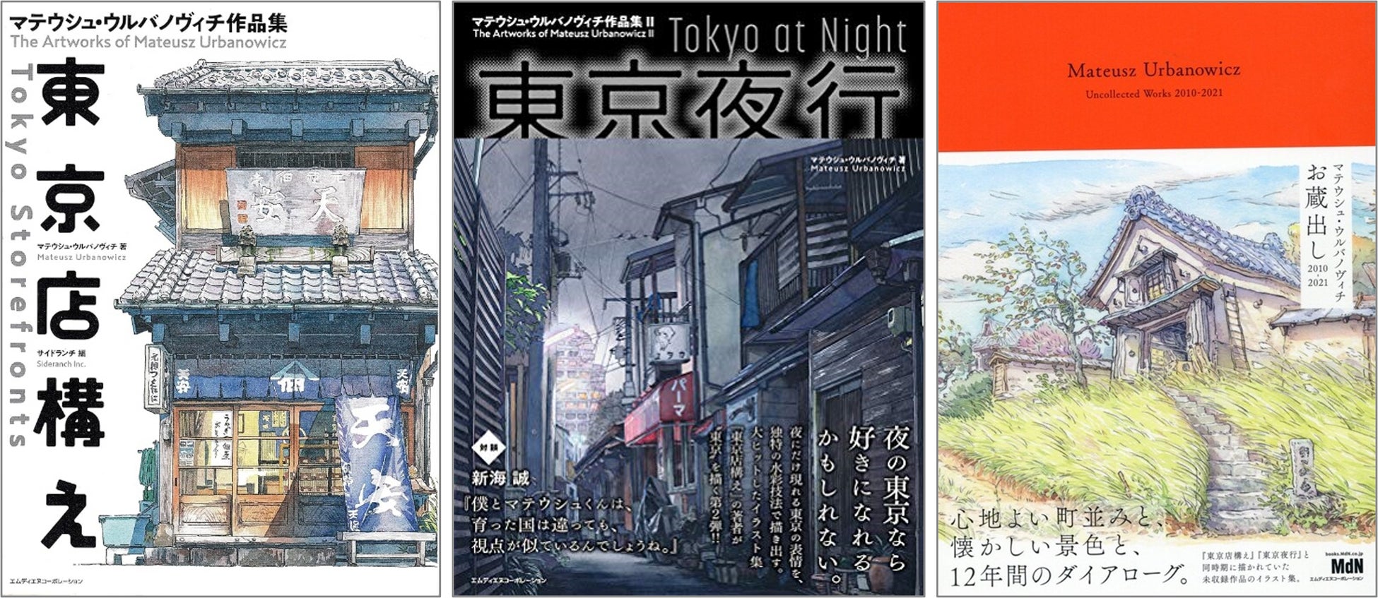 既刊の画集(左から)『東京店構え』『東京夜景』『マテウシュ・ウルバノヴィチお蔵出し2010-2021』(すべてエムディエヌコーポレーション刊)