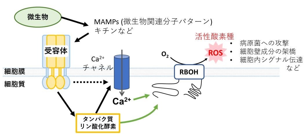 図1.植物の感染防御応答の過程では、微生物由来の分子パターンを認識し、RBOHを活性化することにより活性酸素種(ROS)を積極的に生成する。
