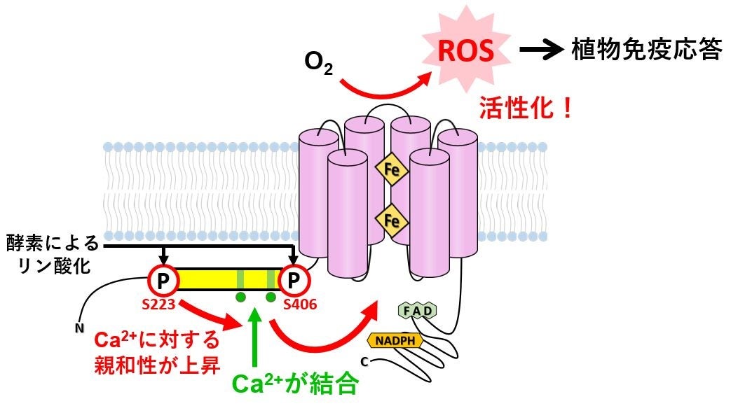 陸上植物に高度に保存された領域(黄色の部分)は、2か所のCa2+結合部位(緑色の部分)を含む。Ca2+が結合しないと、RBOHは活性化されず、活性酸素種(ROS)の生成にはCa2+結合部位へのCa2+の結合が必須である。2か所のセリン残基(赤字)がリン酸化されると、Ca2+の結合親和性が高まる(Ca2+が結合しやすくなる)。