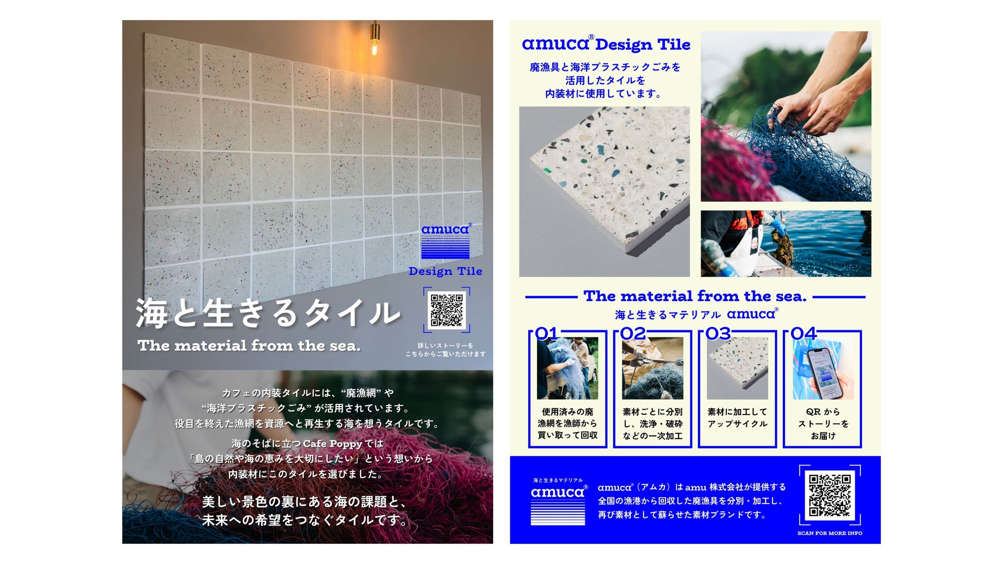 amuca®タイルでは、回収された漁具がタイルになるまでの過程や、導入者がどのような想いで採用に至ったのかをまとめた「トレーサビリティストーリー」をあわせて提供しています。Cafe Poppyでは、このトレーサビリティストーリーをカフェ1階にポスターとして掲示しており、ポスター内のQRコードを読み取ることで閲覧することができます。
