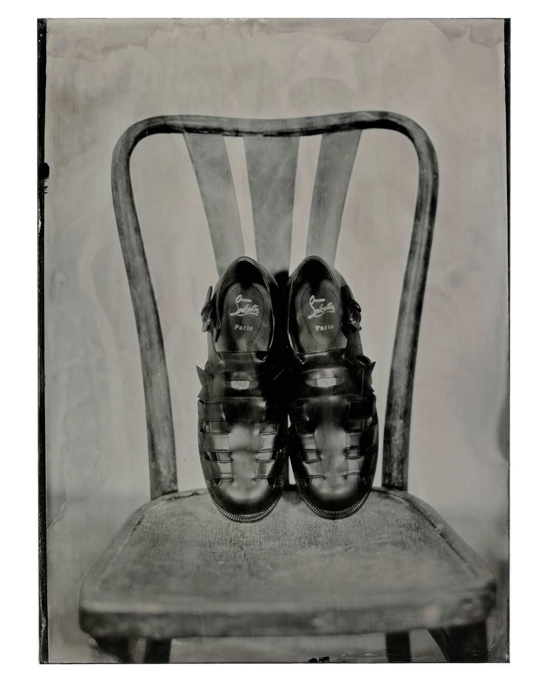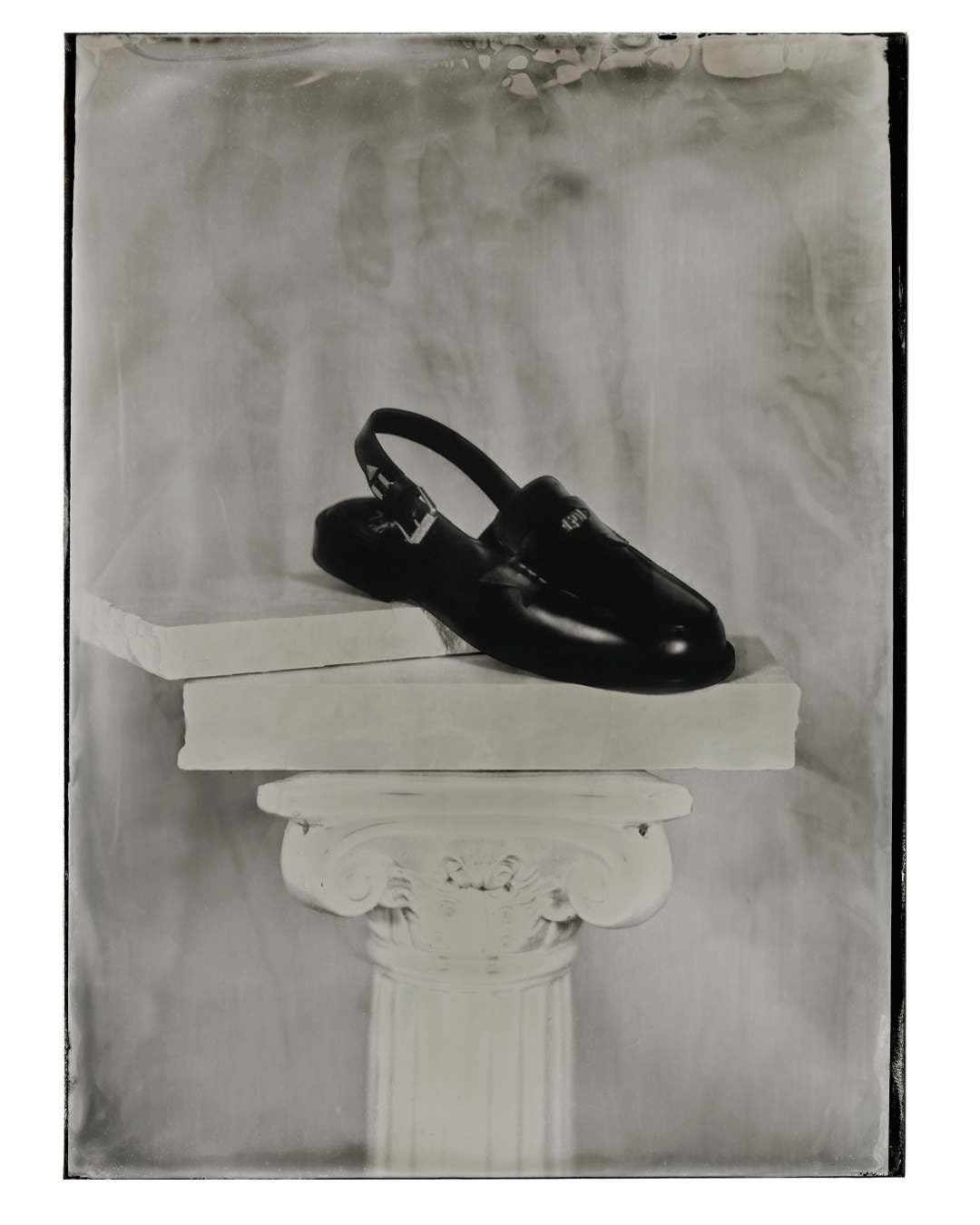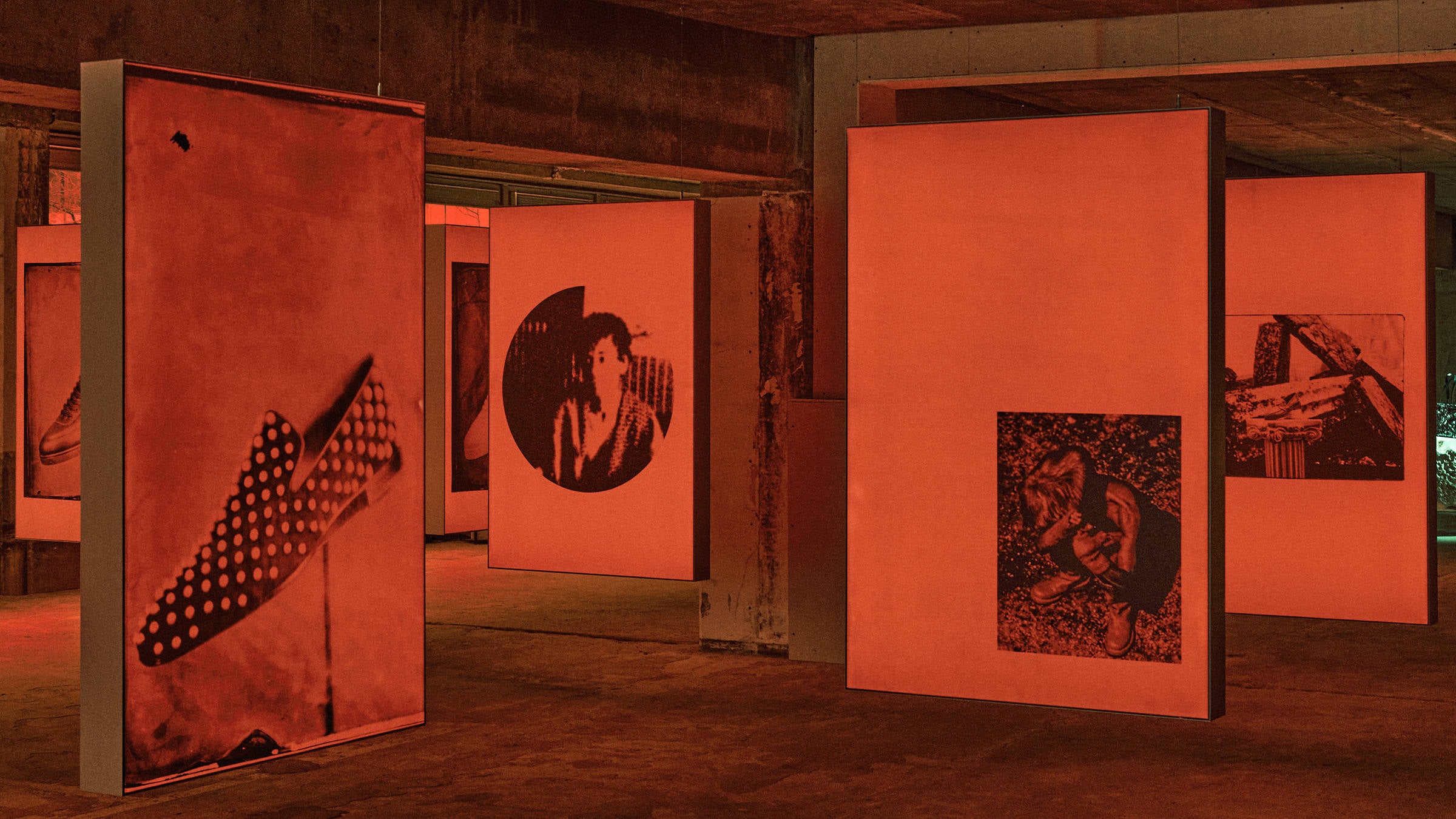 続いてフォト・インスタレーションでは、ジェイデン・スミスのピースを紹介します。その一部は初期の写真技法を用いて撮影され、布の下で撮影されたのち、銀と化学溶液による手作業の現像によって、そのフォルムが浮かび上がります。選ばれた写真は、メゾンのシグネチャーを想起させる赤い光に照らされたネガとしてプリントされています。