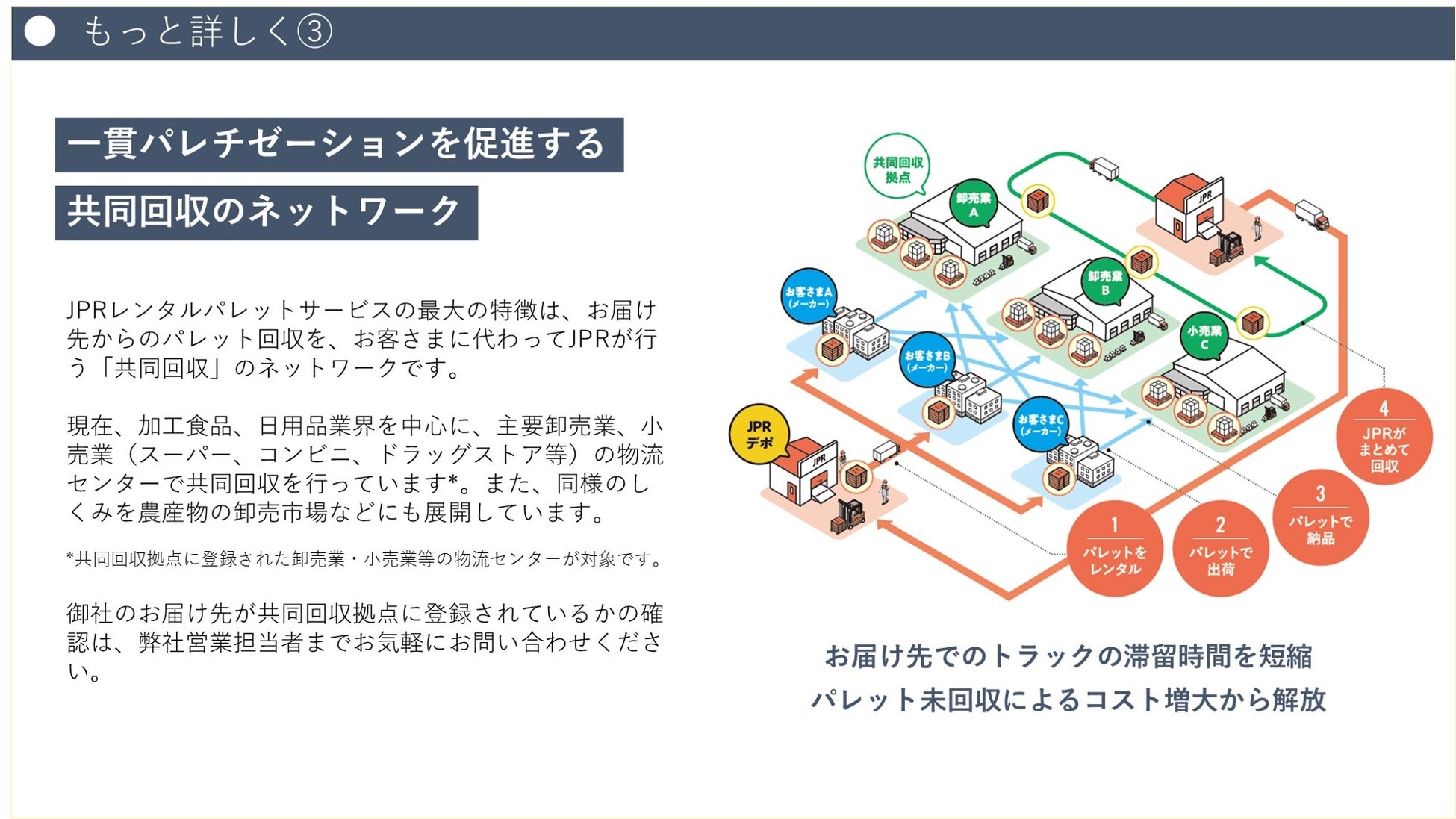 JPRは、1971年の創業以来、標準パレットの共同利用の促進を通じて、物流のつなぎ目で起きやすい、ドライバーによる手荷役作業や長時間の待機を解消・緩和する取り組みを続けてきました。現在約1000万枚のパレットを保有する国内トップシェアのレンタルパレットサプライヤーとして、多様な地域、業種の企業をつないでいます。