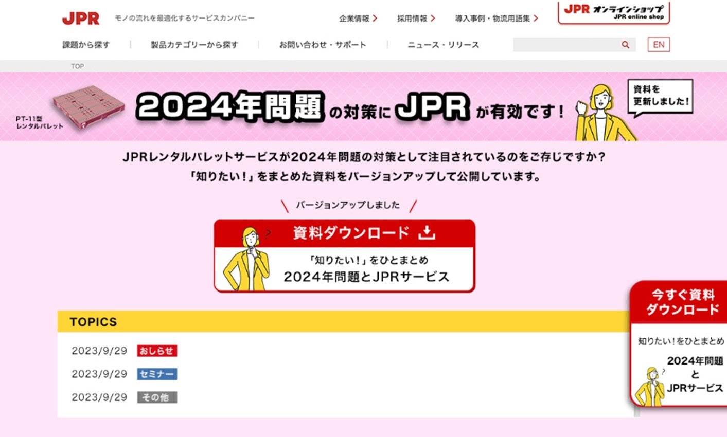 日本パレットレンタル株式会社(東京都千代田区 代表取締役社長 二村篤志 以下、JPR)は、同社のホームページ内の「2024年問題特設ページ」(2023年7月公開)を更新し、JPRレンタルパレットの導入を検討する企業向けに公開している無料ダウンロード資料をバージョンアップしました。