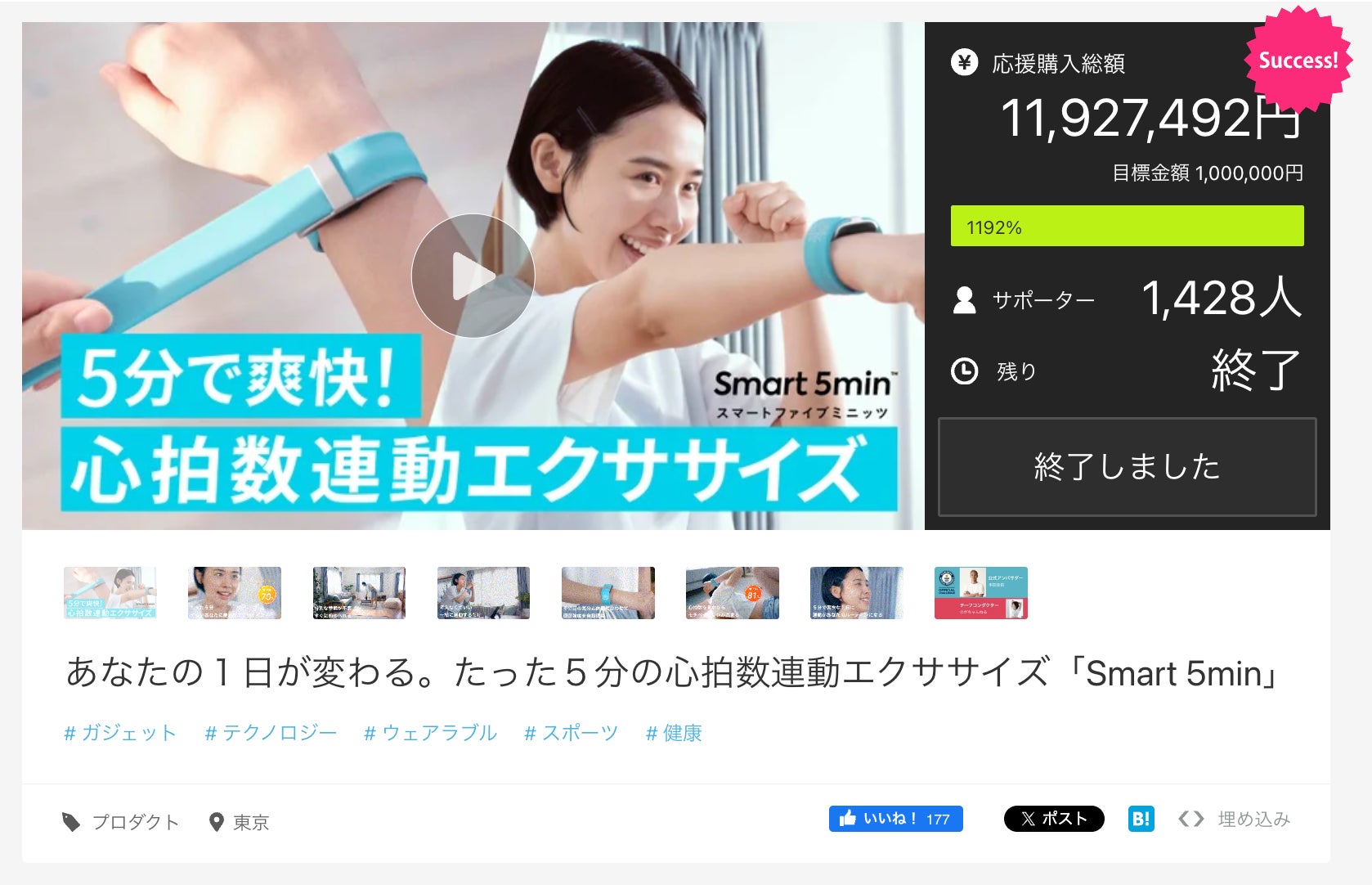 また、過去に「Makuake「から誕生し、1,428名から応援購入され、目標金額を大きく上回る11,927,492円を集めたプロジェクト、心拍数連動オンラインエクササイズサービス「Smart 5min」の専用スマートバンドの展示を行います。