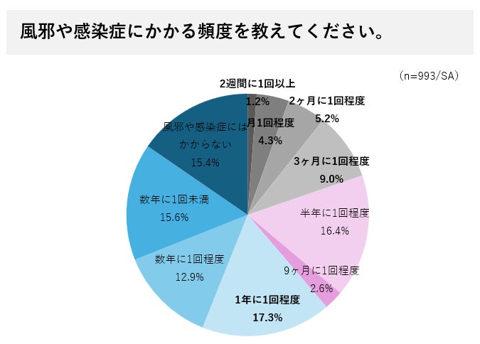 ・実際に、風邪や感染症にかかる頻度について問うと、中央値は「1年に1回」。一方で、5人に1人は3ヶ月に1回以上風邪や感染症にかかると回答。