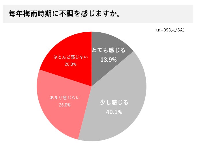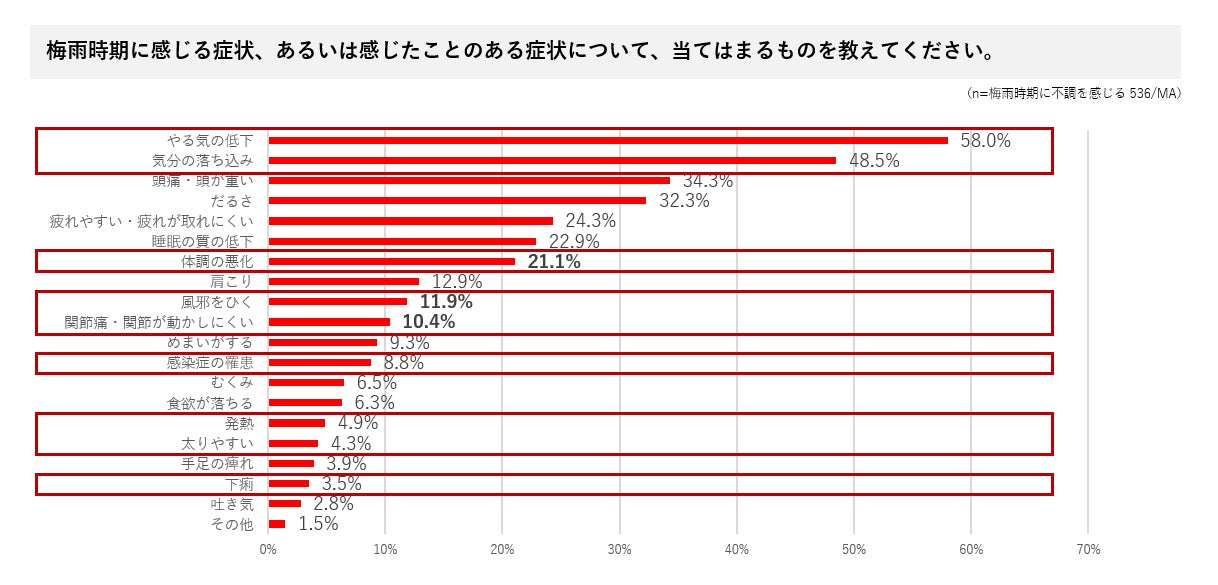 ・毎年梅雨時期に不調を感じる人は54.0%に上りました。不調を感じたことがある人に梅雨時期の症状について問うと、1位「やる気の低下」、2位「気分の落ち込み」、3位「頭痛・頭が重い」という結果に。