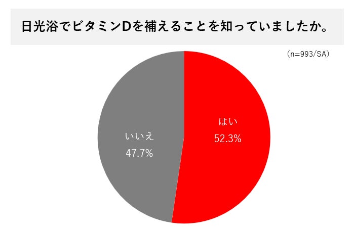 ・現代人がビタミンD不足であることが知っている人は約半数。日光浴からビタミンDが得られることを知っていたのは半数以上。一方で、日焼け止めは体内のビタミンDの生成を抑制することを知らなかった人は、7割以上。