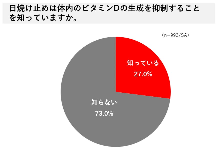 ・現代人がビタミンD不足であることが知っている人はおよそ半数(48.7%)に上りました。また日光浴からビタミンDが得られることを知っていたのはおよそ半数という結果に。一方で、日焼け止めは体内のビタミンDの生成を抑制することを知らなかった人は、7割以上(73.0%)にのぼりました。