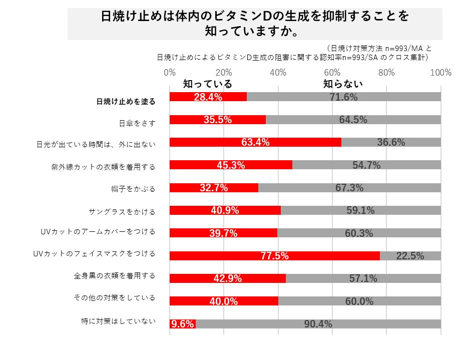 ・「日光が出ている時間は、外に出ない」「UVカットのフェイスマスクをつける」人は、日焼け止めがビタミンDの生成を阻害する事実を知っている人が多い結果となりました。