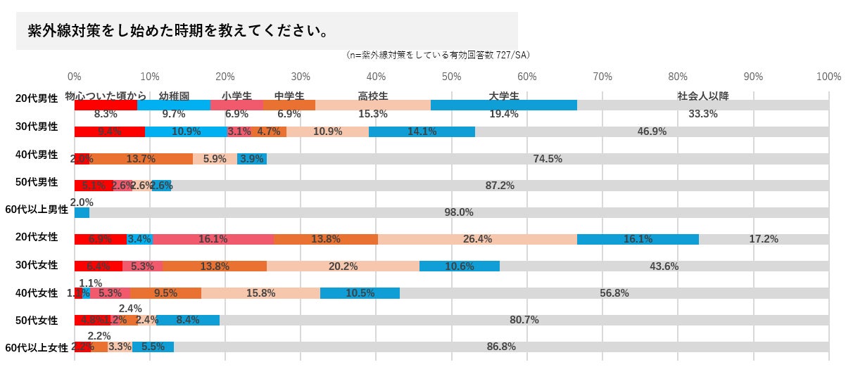 ・紫外線対策をし始めた時期については、男女ともに50代以上は8割以上が「社会人以降」と回答。