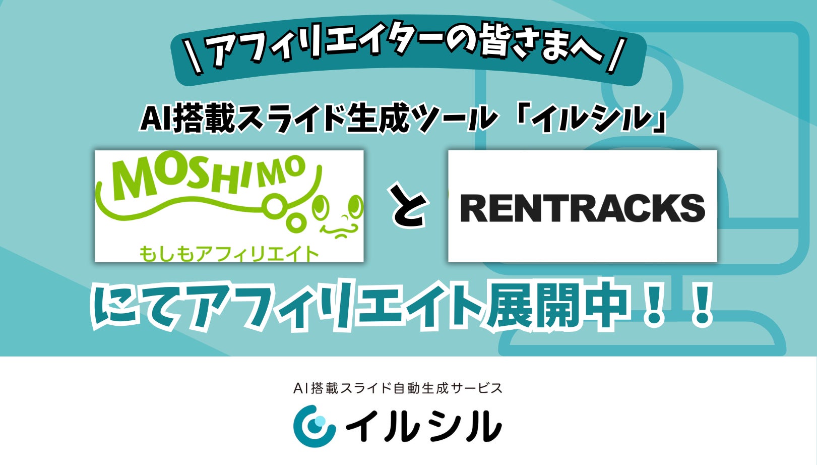 AI搭載スライド自動生成サービス「イルシル」は、「もしもアフィリエイト」および「レントラックス」上にてアフィリエイトプログラムを展開中です。