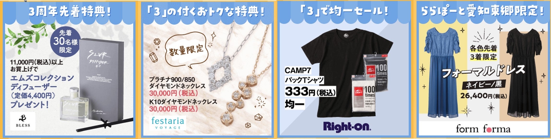 また、“3”にかけた均一セールや、ららぽーと愛知東郷限定アイテムや価格でお買い物も楽しむことができます。