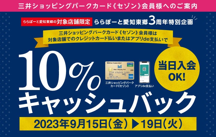 期間中にららぽーと愛知東郷の対象店舗にて、三井ショッピングパークカード≪セゾン≫などの対象カードで、クレジット払いまたはアプリde支払いをするとご請求時に一括で、購入金額の10%がキャッシュバックとなります。