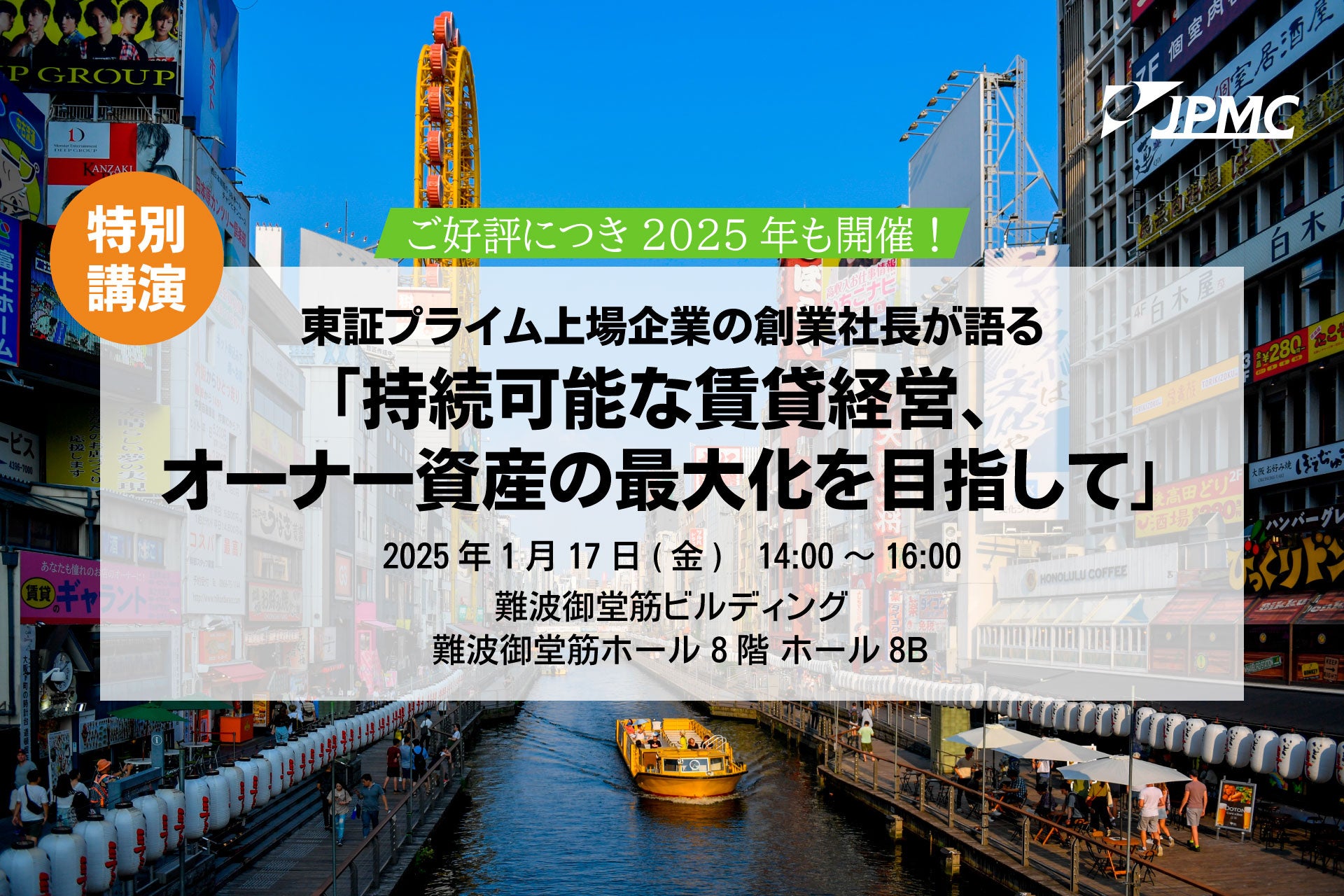 “持続可能な賃貸経営”を追求する株式会社JPMC(本社:東京都千代田区、代表取締役 社長執行役員:武藤 英明、以下「JPMC」)の代表 武藤 英明が、2025年1月17日(金)に高島屋ファイナンシャル・パートナーズ様主催の賃貸住宅オーナー向けの経営セミナーに登壇いたします。