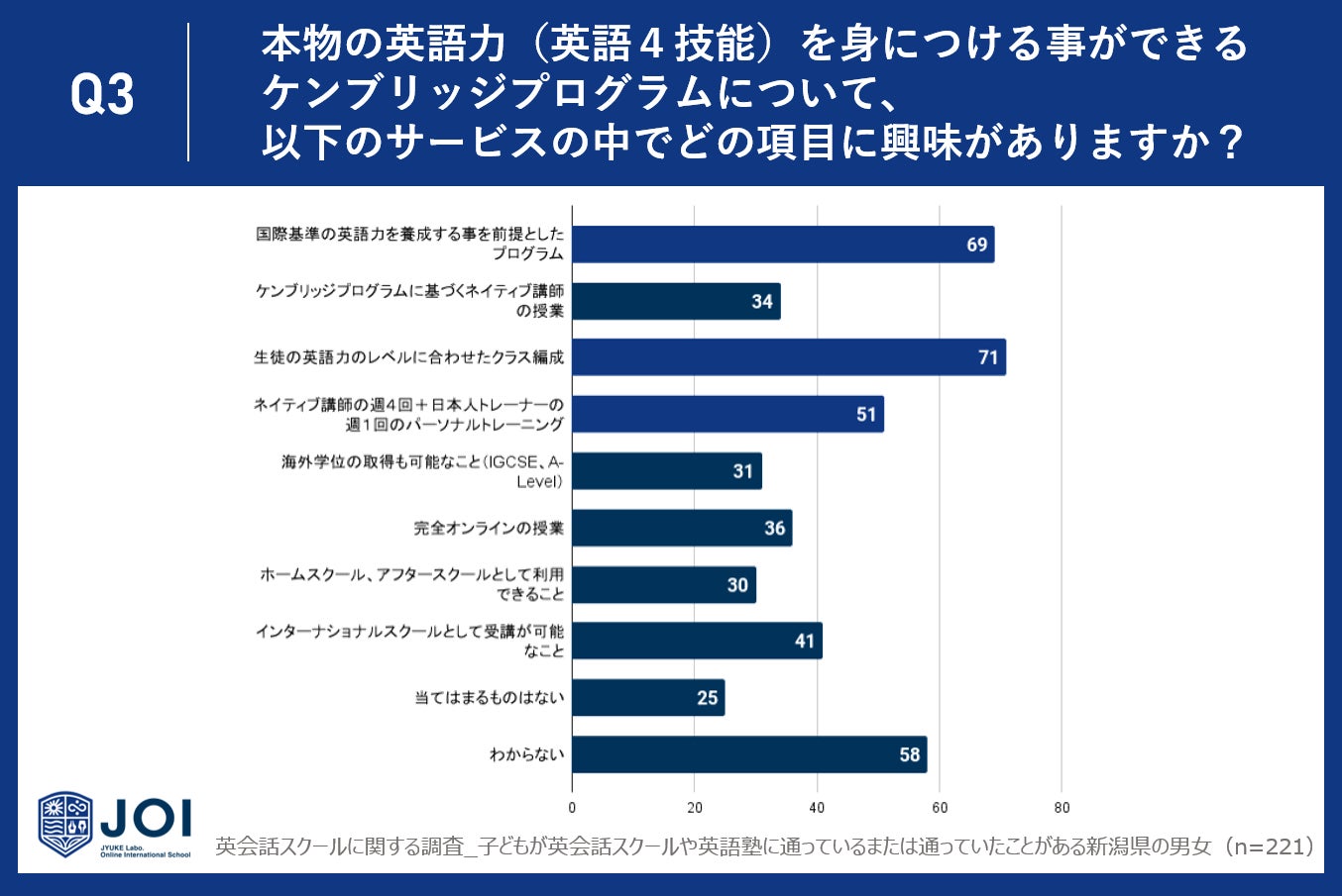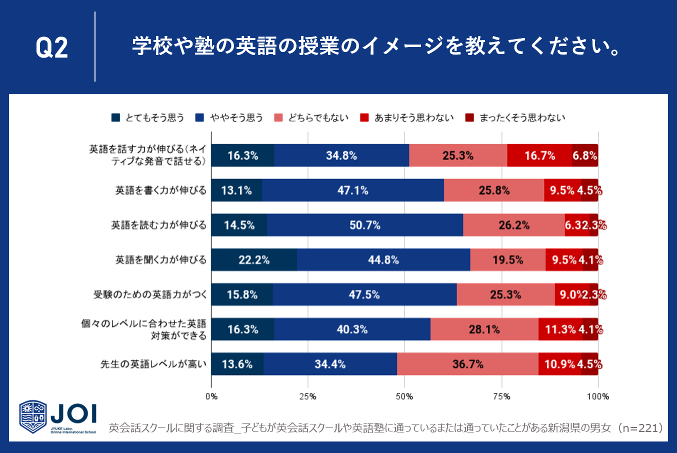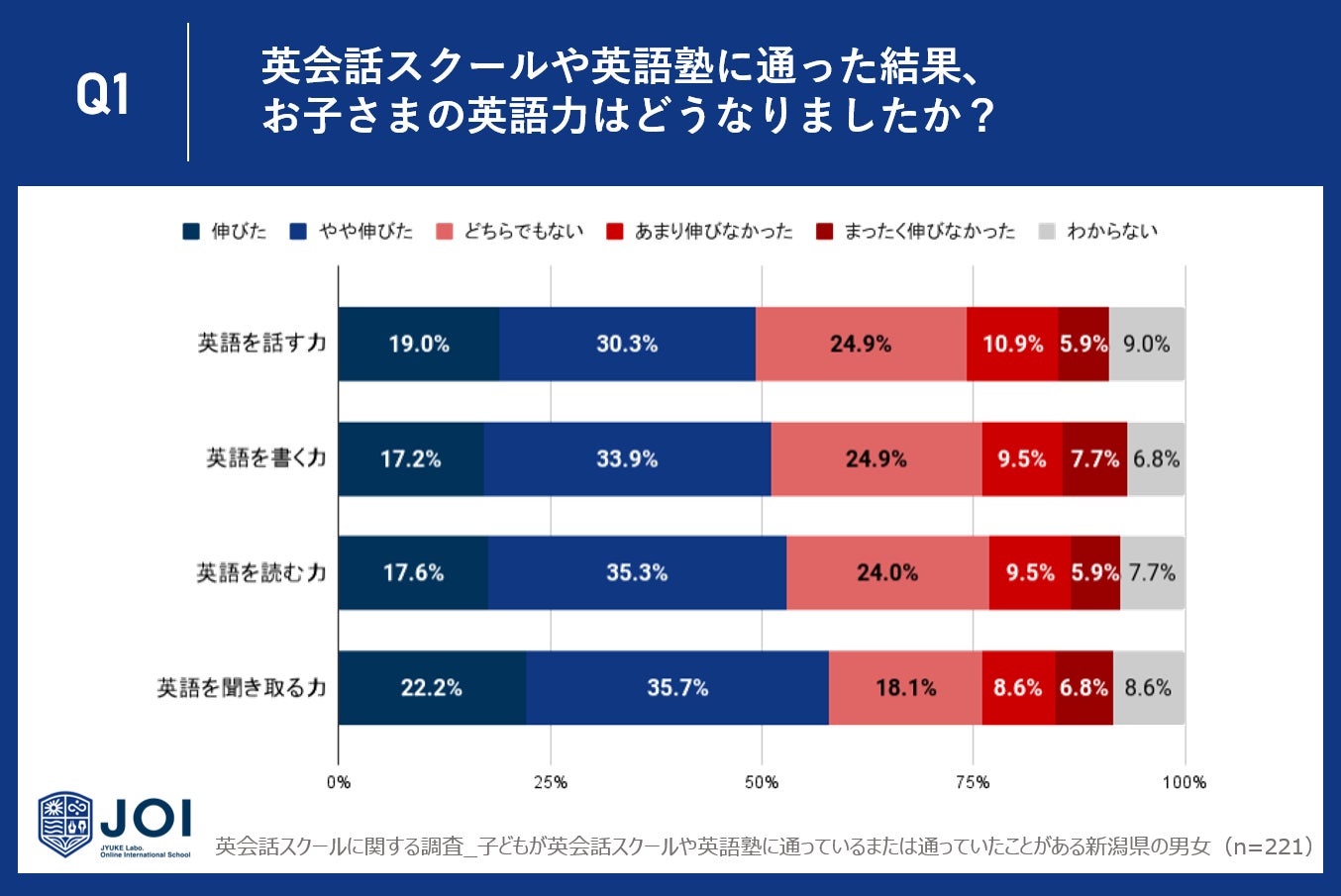 今回は、子どもが英会話スクールや英語塾に通っているまたは通っていたことがある新潟県の男女221人に、英会話スクールや英語塾の効果に関するアンケート調査を実施しました。