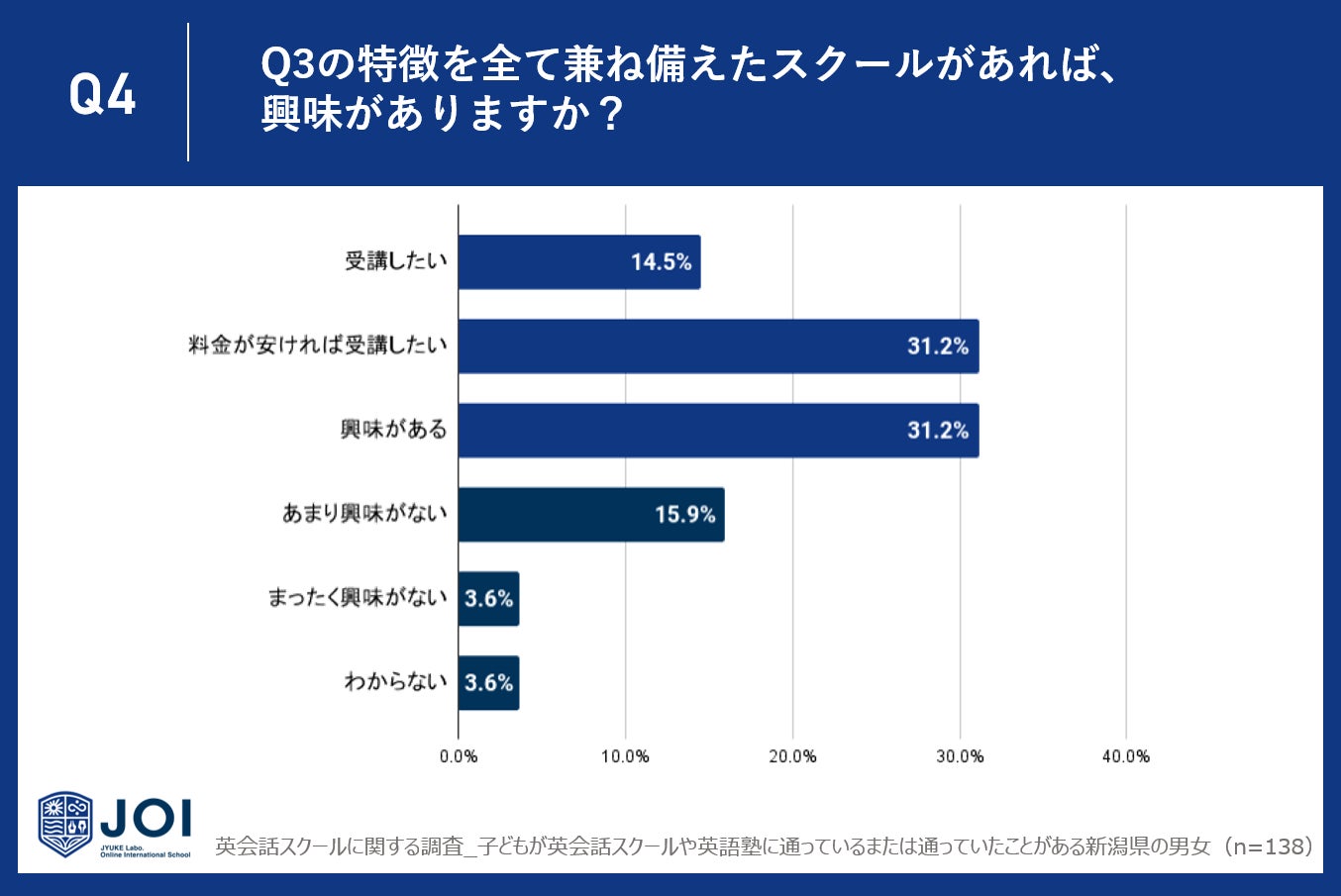 Q4で「Q3の特徴を全て兼ね備えたスクールがあれば、興味がありますか?」と質問したところ、新潟県では14.5%が受講を希望し、31.2%は料金が手頃であれば受講したいと考えています。さらに、31.2%は興味を示していると回答しました。多くの人がこのような特徴を持つスクールに一定の興味を示していることが分かります。