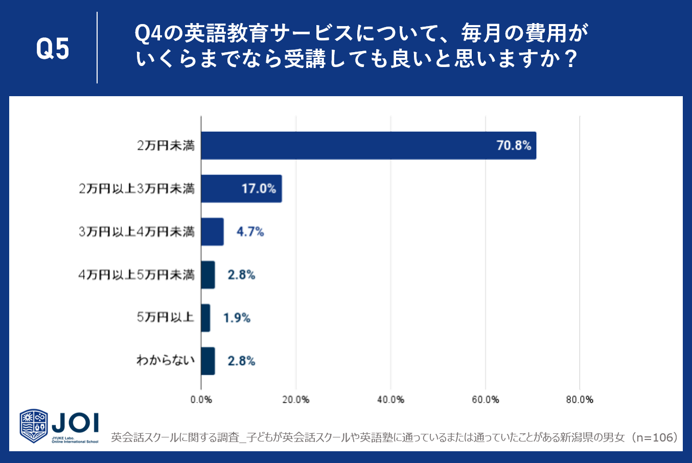 Q4で「受講したい」「料金が安ければ受講したい」「興味がある」と回答した人に、Q5で、「Q4の英語教育サービスについて、毎月の費用がいくらまでなら受講しても良いと思いますか?」と質問したところ、最も多い70.8%の回答者は2万円未満が適切と感じています。17.0%は2万円以上3万円未満、4.7%は3万円以上4万円未満と答えました。対照的に、4万円以上の費用を考える回答者は極少数で、4万円以上5万円未満が2.8%、5万円以上が1.9%でした。これにより、新潟県では多くの人が3万円未満の価格帯を望んでいることが明らかとなりました。