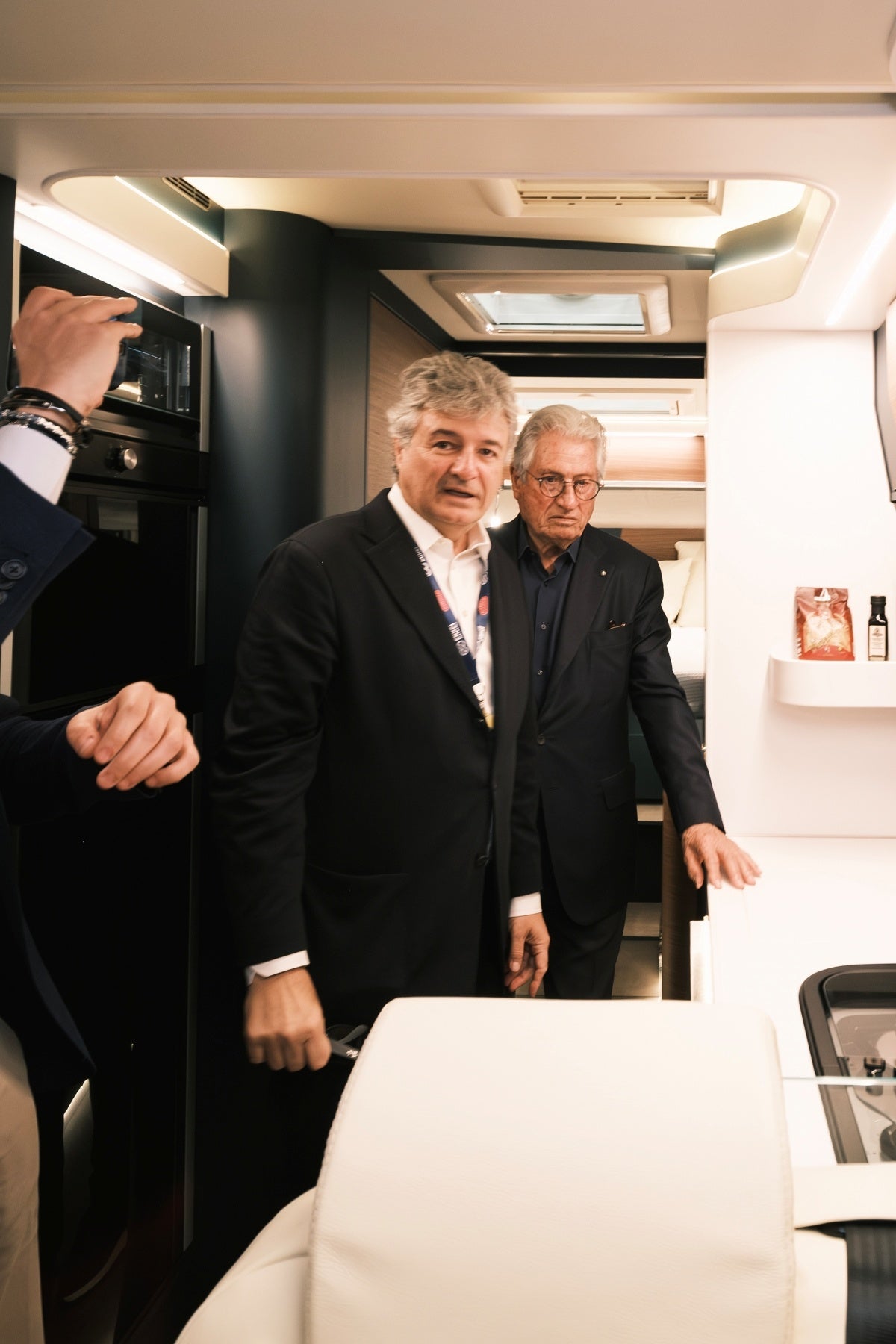 イタリア製モーターホーム LAIKA/KREOS L 5009を見学されたジウジアーロ氏は、外装および内装デザインの全てを自身(GFGスタイル)で手掛けたものの、完成した実車車両を目にするのは初めてだったため、大変興奮した様子で車内装飾や家具の作りなどを確認されていました。