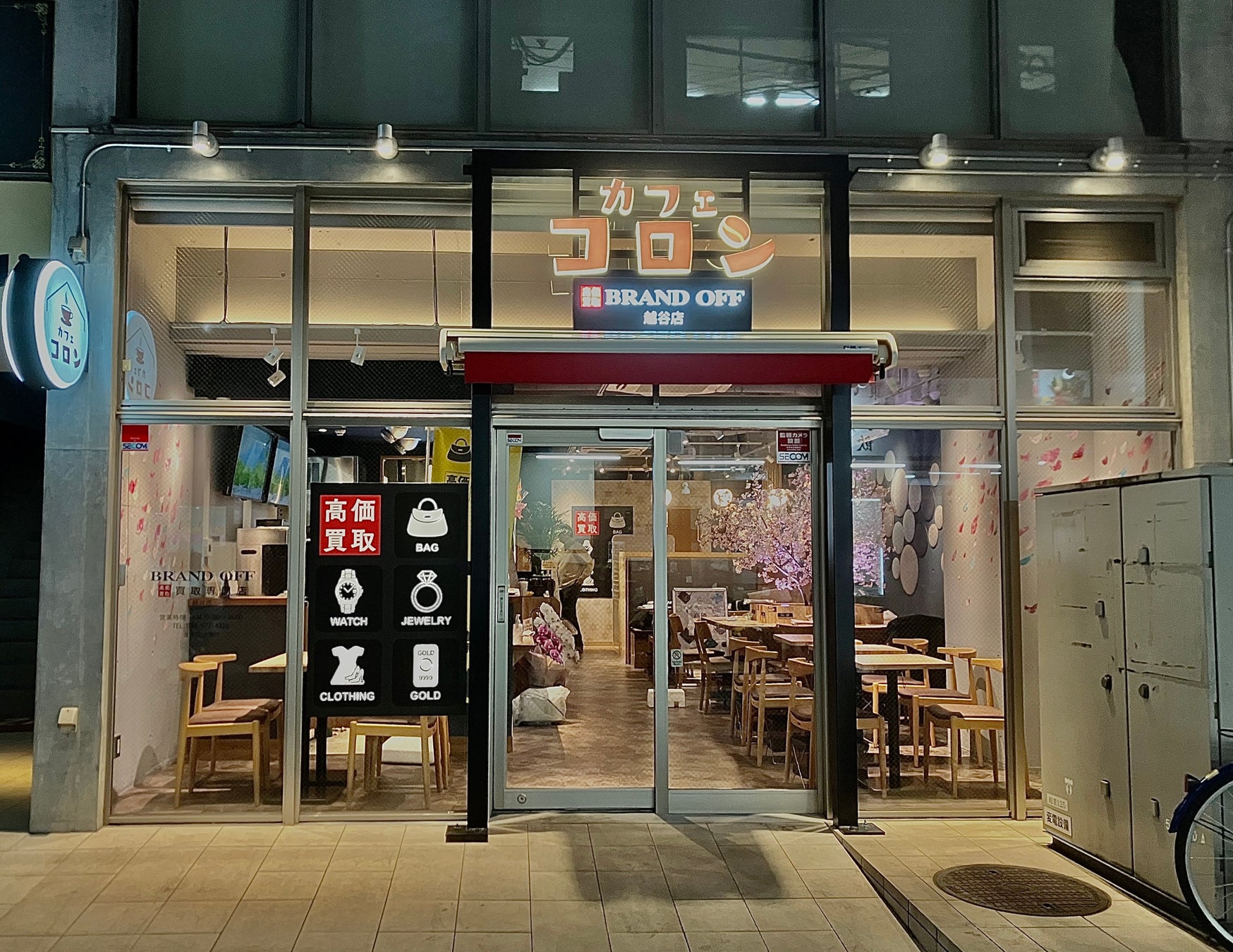 今回出店するのは、越谷駅東口から徒歩約2分のところに位置する、幅広いシーンで利用することができる「カフェコロン」の店内にございます。買取店×カフェという新しいスタイルで今までにない顧客体験が期待できます。駅チカで周辺には多くの商業施設があり、人通りも多いため、利便性の高さが魅力のエリアです。