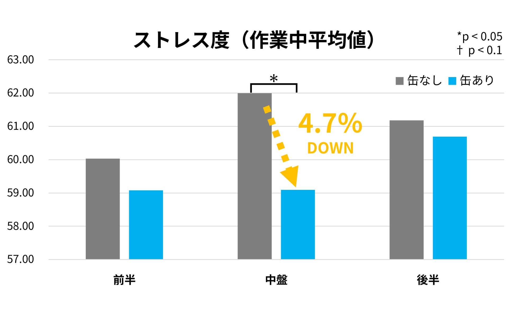 共同作業時に「温かいスチール缶を持つ」ことが、どのような影響を与えるかを検証したところ、作業中(中盤)のストレス度が4.7%減少していることが明らかになりました。