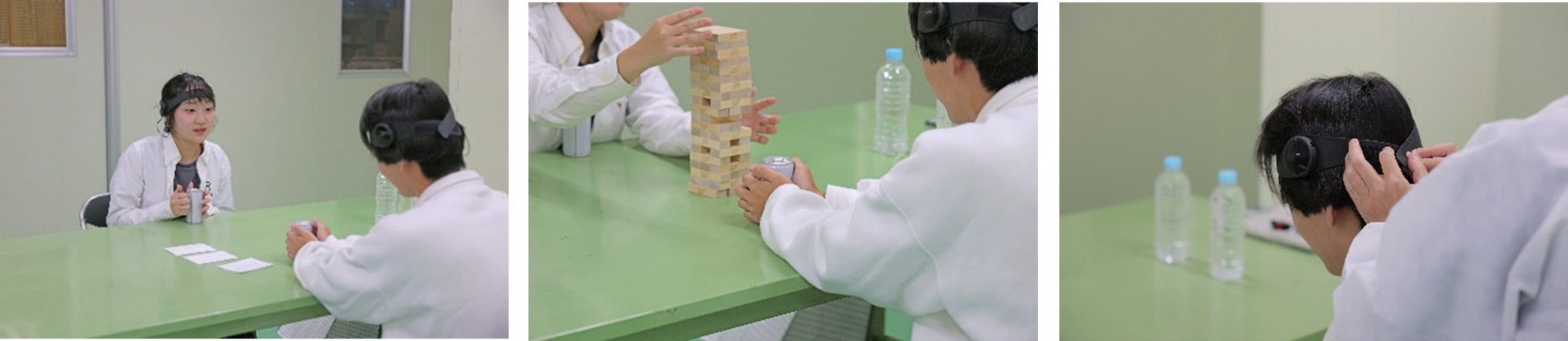 実験①会話 温かいスチール缶を持つ、持たない両方のシチュエーションでの会話中とその前後の脳波計測を実施し、脳波からの感性値と事後アンケートの評価を実施。 実験②作業 温かいスチール缶を持つ、持たない両方のシチュエーションでの共同作業として積み木を用いたタスク中とその前後の脳波計測を実施し、脳波からの感性値と事後アンケートの評価を実施。 |