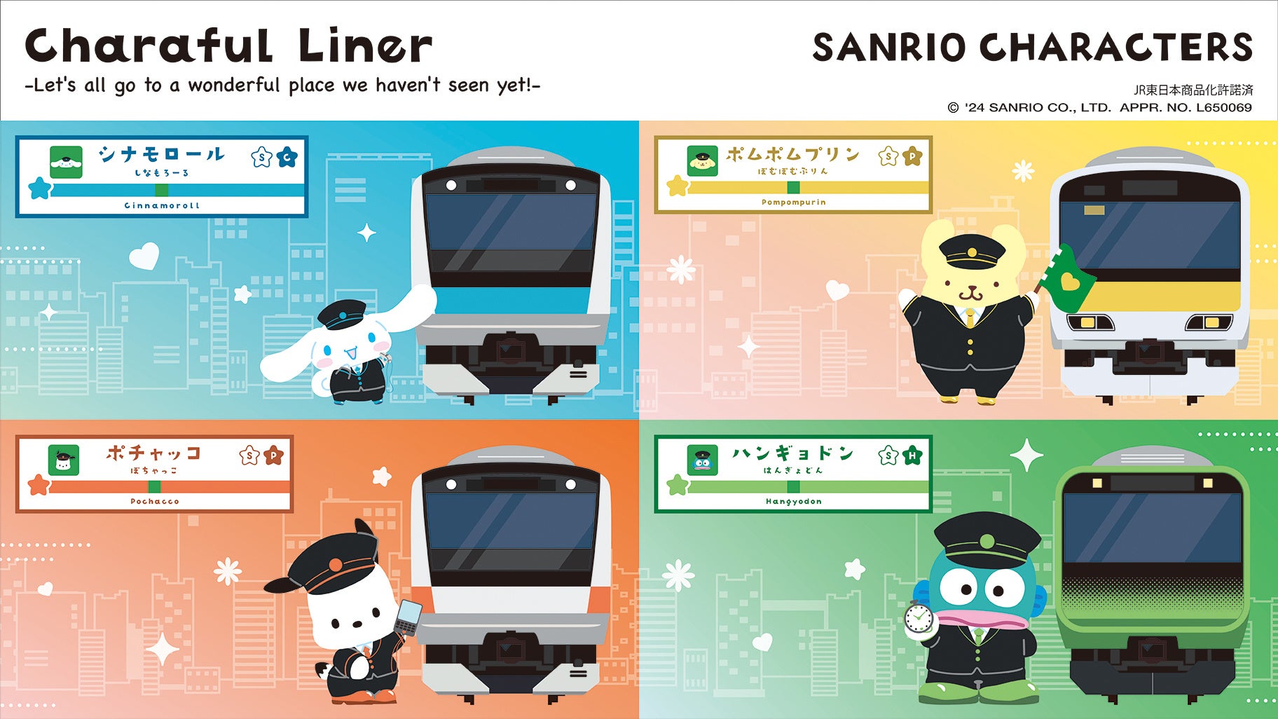 シナモロール、ポムポムプリン、ポチャッコ、ハンギョドンの4キャラクターが車掌さん風でとっても可愛い。