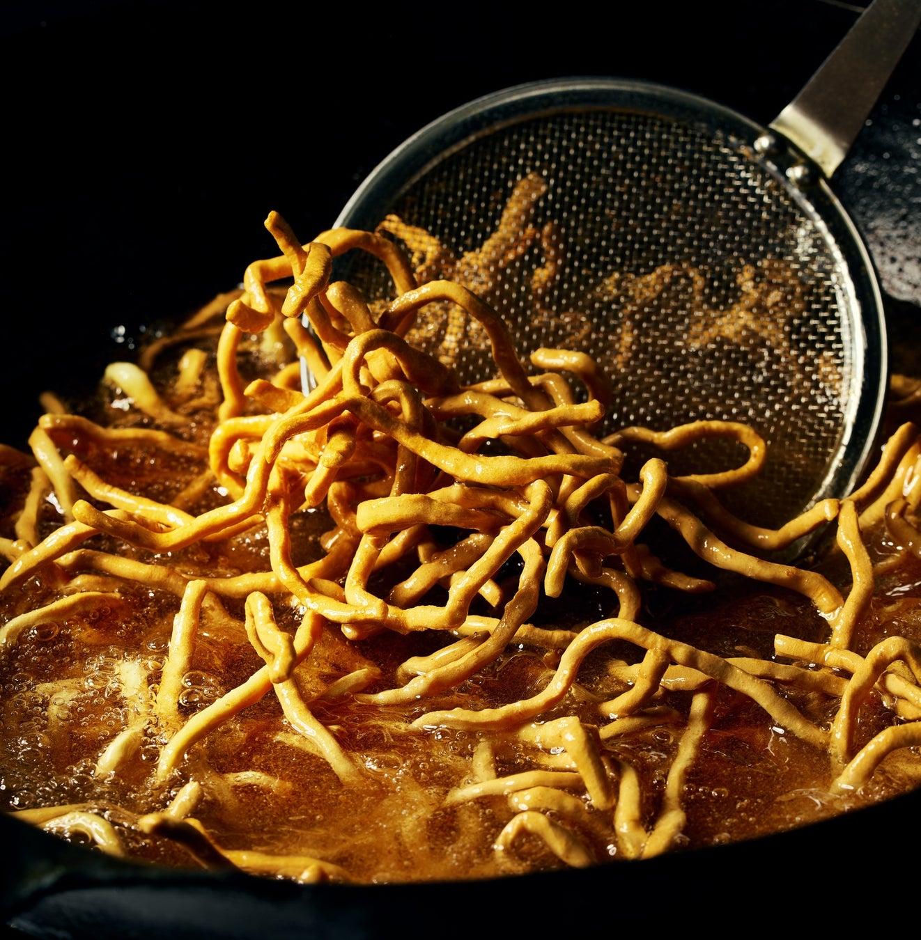 ラーメンの決め手は麺。数種類の小麦粉を使い、スナックとして食すのに最適な配合で自家製麺を作り、製麺してすぐに独自の揚げ麺機で三度揚げします。1 度目を中温、2 度目は低温、3 度目に再び高温にすることでガリっとした食感に。
