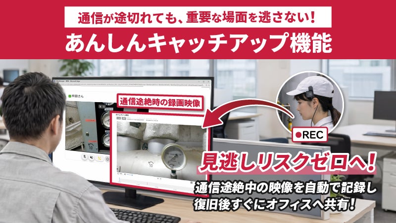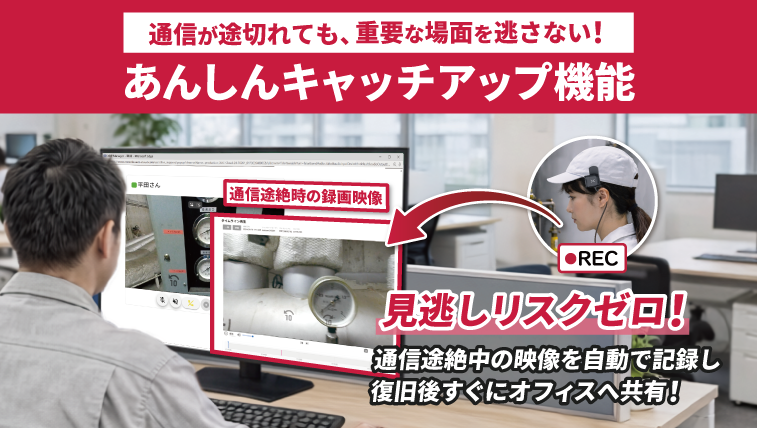 「あんしんキャッチアップ」機能は、こうした課題を解決するために開発した新機能。遠隔支援中に通信が途切れても、現場側でその間の映像を自動録画し、通信復旧後に、途切れた間に見逃した映像を支援者がすぐに確認できます。これにより、手戻りや再訪問を最小限に抑え、現場作業の効率と品質の向上に貢献します。
