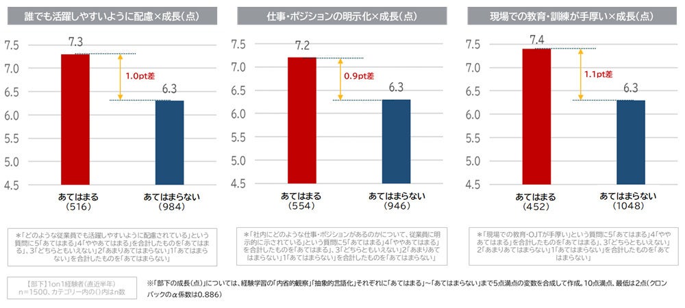 「誰でも活躍しやすい環境」「仕事・ポジションの明示」「教育・訓練の手厚さ」に『あてはまる』と回答した部下は、成長度(10点満点)が7.2~7.4点と高く、『あてはまらない』場合(6.3点)と比べおよそ1.0ptの差があった。