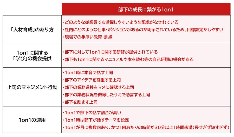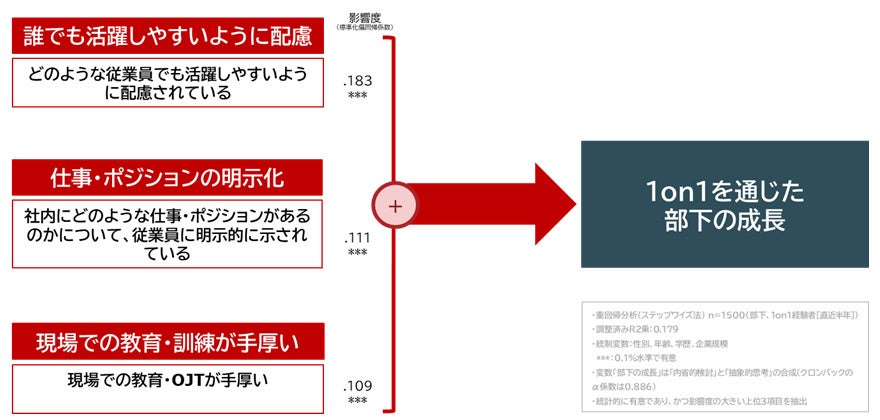 上述した「誰でも活躍しやすい環境」「仕事・ポジションの明示」「教育・訓練の手厚さ」の要素が1on1を通じた部下の成長にもプラスの影響を与えていることが確認された。部下が目標設定しやすく、学びの機会も豊富にあり、どのような従業員であれ活躍できるような人材育成を重視する組織風土のもとでは、1on1の効果も高まることを示唆している。