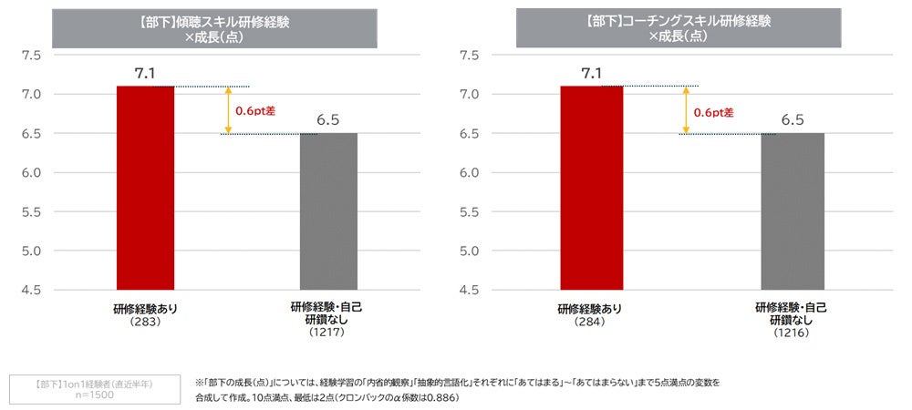 傾聴スキル研修やコーチングスキル研修を受講した部下は、研修を受講していない部下よりも成長度が高かった(傾聴スキル「研修経験あり」7.1点、「研修経験・自己研鑽なし」6.5点。コーチングスキル「研修経験あり」7.1点、「研修経験・自己研鑽なし」6.5点)。