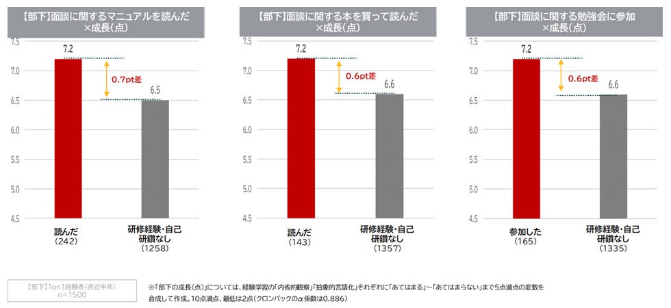 「面談に関するマニュアルを読む」「面談に関する本を買って読む」「面談に関する勉強会に参加する」といった自己研鑽を行った部下は、それらの自己研鑽を行っていない部下よりも成長度が高かった(面談に関するマニュアルを「読んだ」7.2点、「研修経験・自己研鑽なし」6.5点等)。