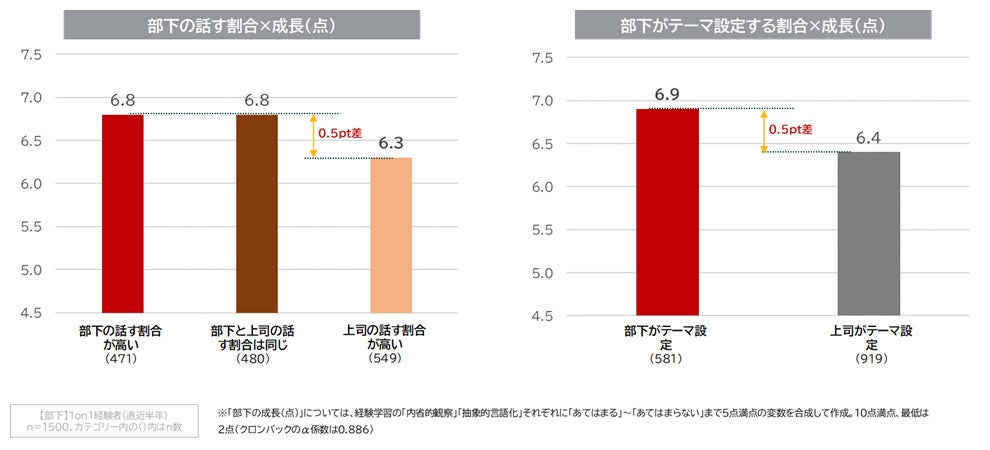10. 1on1時に上司より部下の話す割合が高い方が部下の成長度も高くなっていた(「部下の話す割合が高い」6.8点、「上司の話す割合が高い」6.3点)。また、1on1時に上司より部下がその日に話すテーマを決めているほど、部下の成長度も高くなっていた(「部下がテーマ設定」6.9点、「上司がテーマ設定」6.4点)。