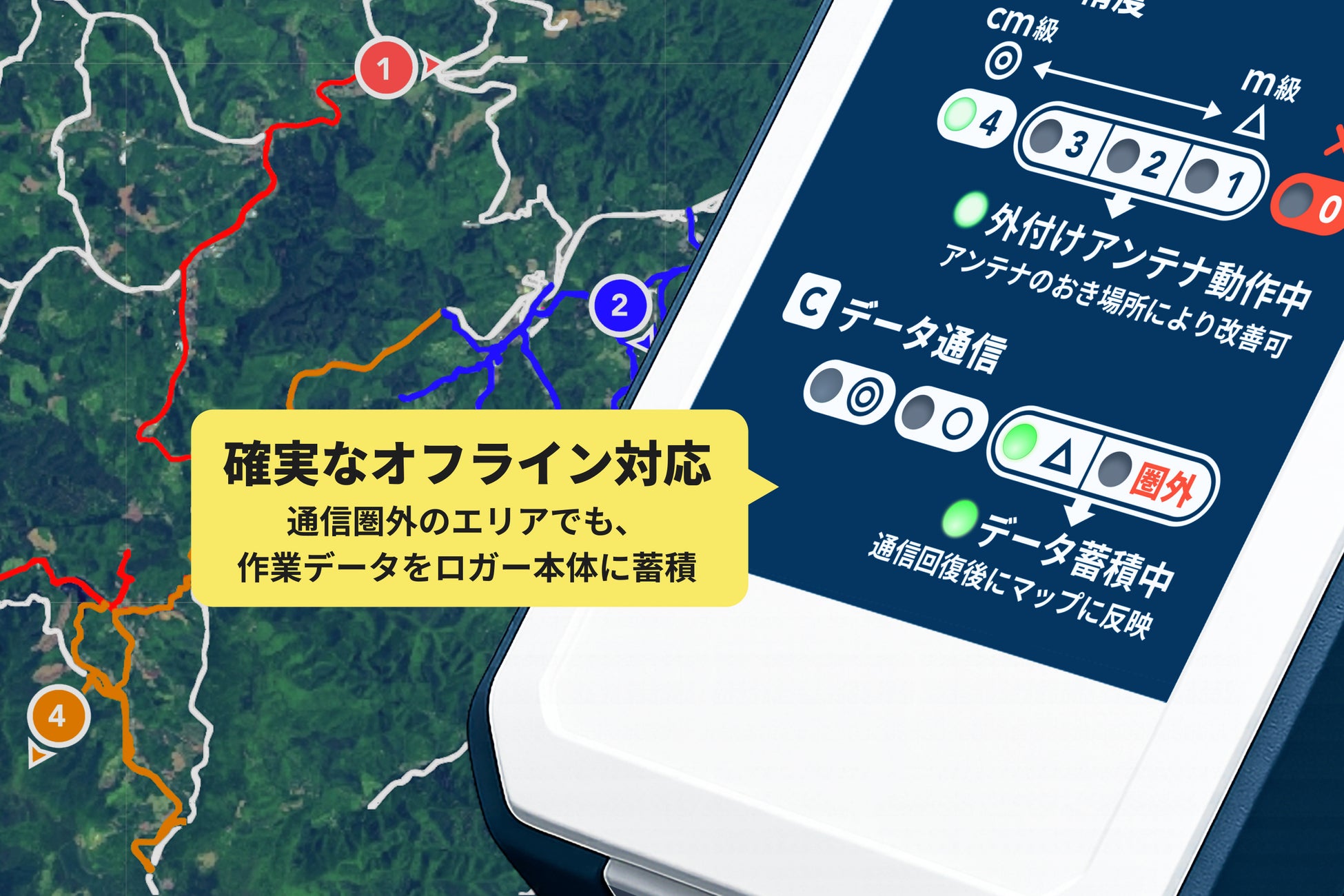 通信圏外のエリアでも、最大24時間分の作業データをロガー本体に蓄積し続けます 。通信圏内に戻るとデータは自動で送信されるため、山間部での作業記録も取りこぼすことはありません。