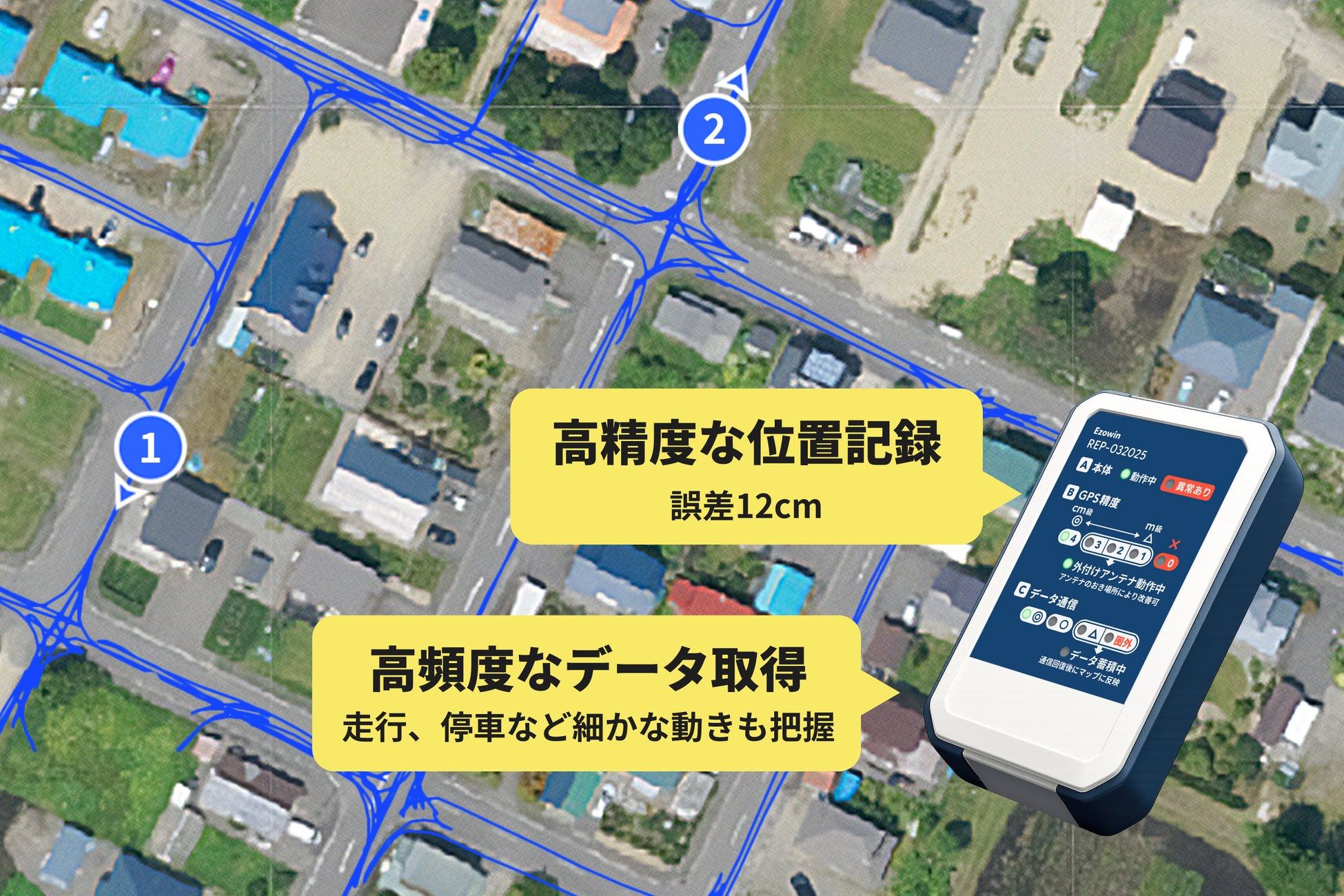 準天頂衛星みちびきのCLASに対応したGPSロガーが、誤差12cmの精度で位置情報を1秒単位で自動記録します 。 車両の電源に接続するだけで、オペレーターの操作は一切不要です 。